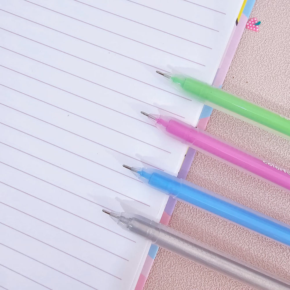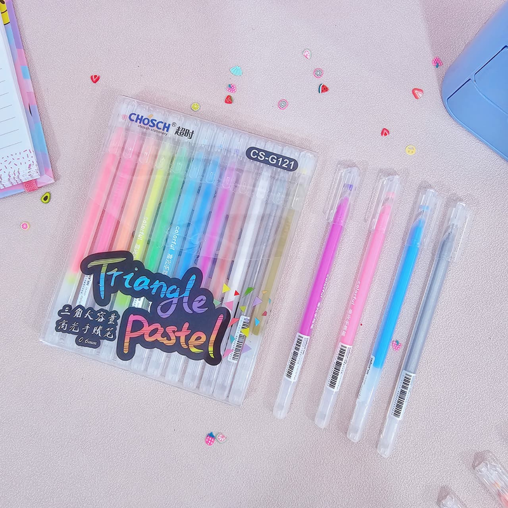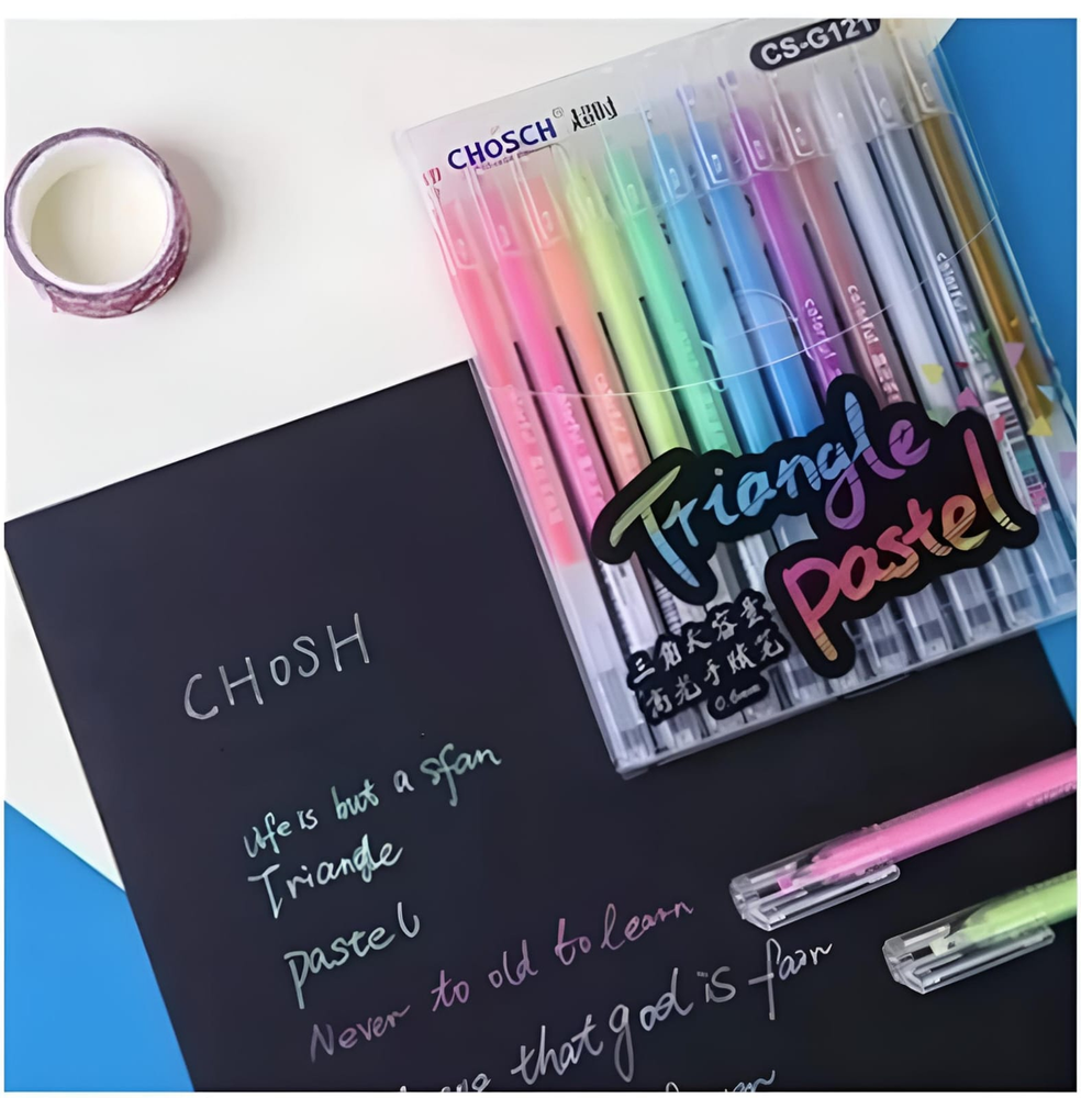 (Set de 12 Biromes de gel marca CHOSCH. Tienen tinta de gel de colores neones. Su Punta fina de 0.6 mm. Tienen un diseño ergonómico de agarre cómodo y una forma triangular. Son adecuados para escribir y dibujar, especialmente en papel oscuro o negro, ya que los colores neones y metálicos se destacan en este tipo de superficies).