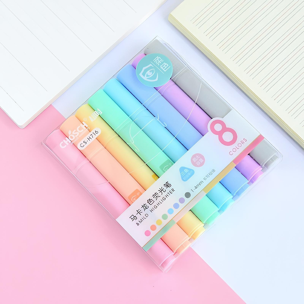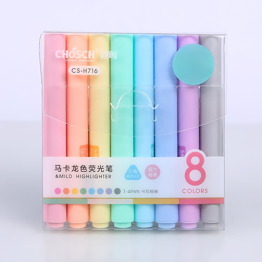 (Set de 8 resaltadores CHOSCH modelo . Ayudan a organizar y categorizar la información visualmente mediante el uso de diferentes colores. Tienen una punta biselada que permite escribir o dibujar con diferentes grosores de línea (entre 1 y 4 mm), lo que los hace versátiles para tomar notas o para proyectos creativos).