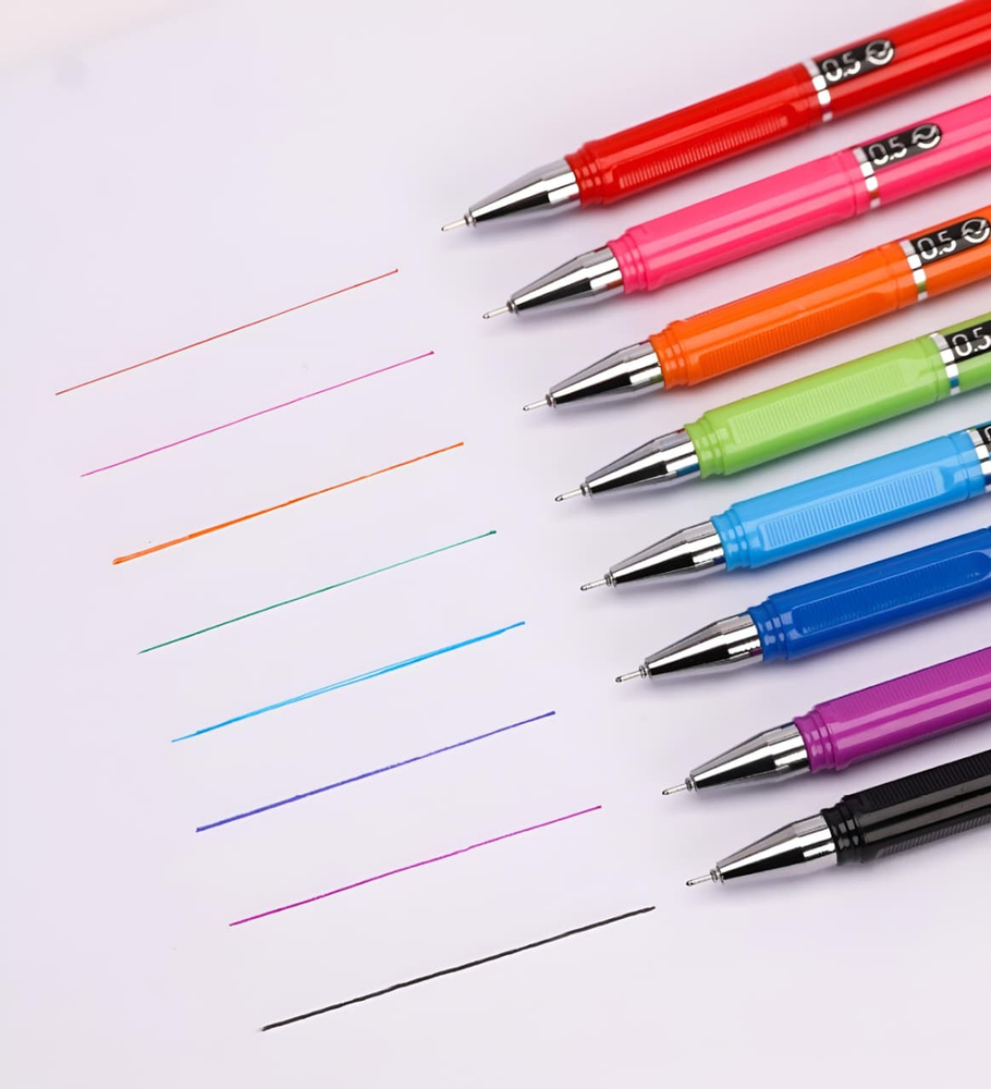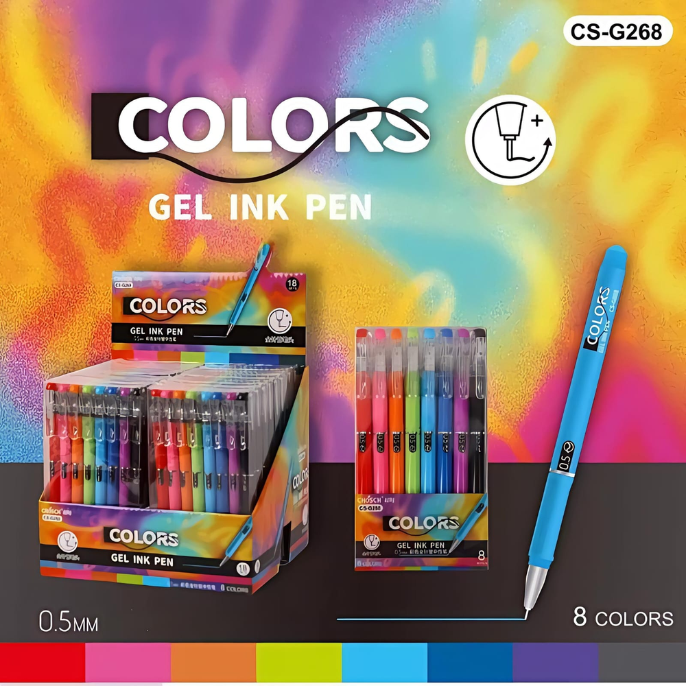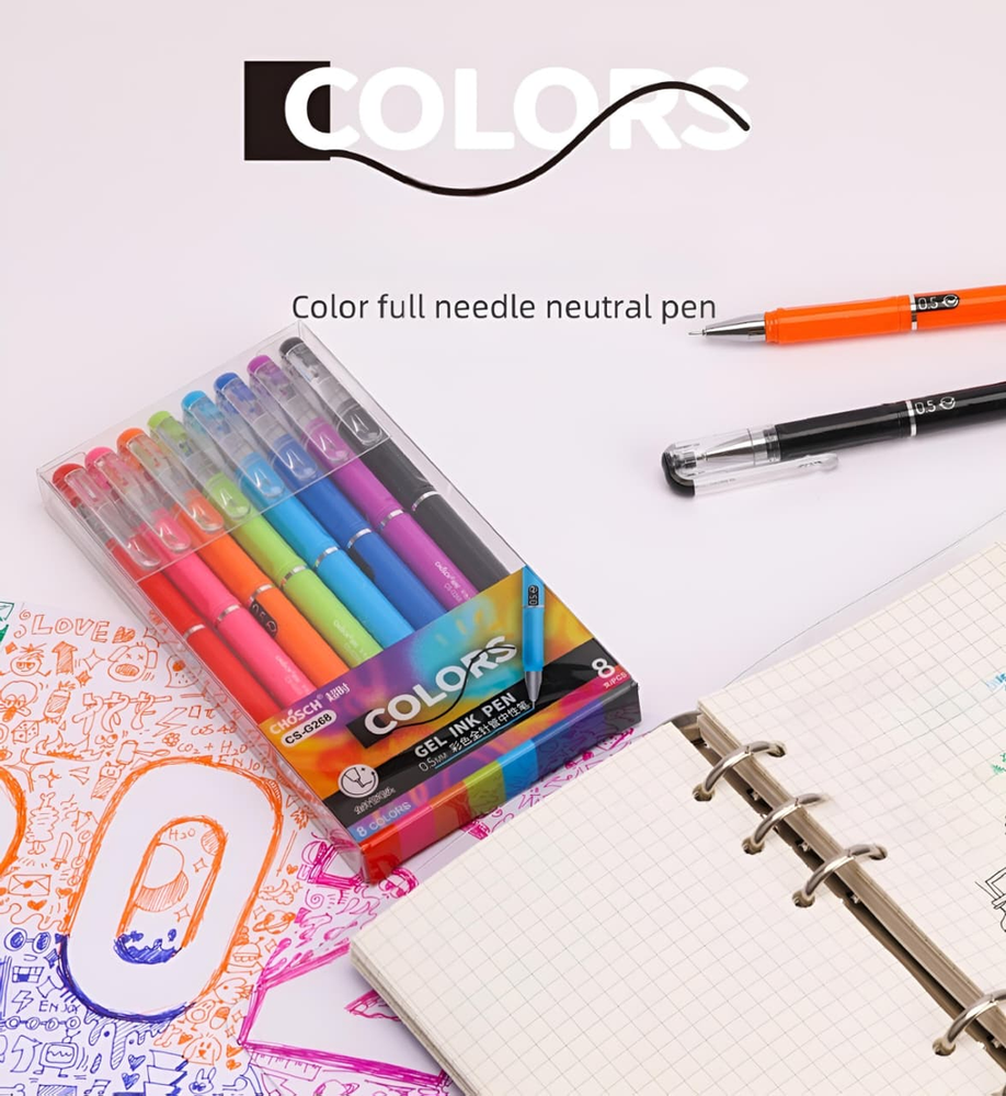 (Set de 8 biromes de gel de la marca Chosch. Los bolígrafos de gel se caracterizan por usar una tinta a base de agua que contiene pigmentos en polvo, lo que produce una escritura suave y colores más vívidos y opacos que los bolígrafos tradicionales. Son útiles para diversas actividades, incluyendo: Escribir y tomar notas, ya que su tinta de secado rápido resiste las manchas y no traspasa el papel).