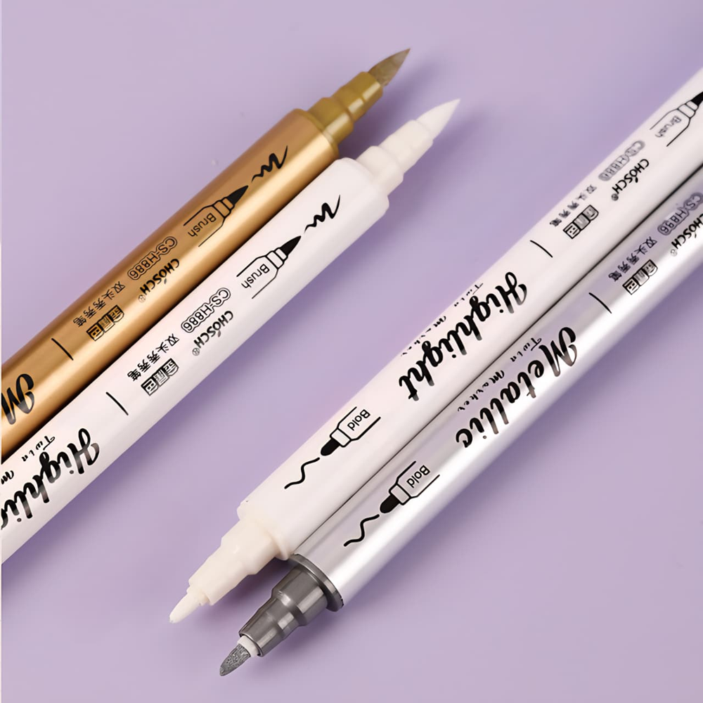 (Set de 4 resaltadores CHOSCH metálicos de doble punta. Estos marcadores son herramientas versátiles para proyectos creativos y artísticos. Tienen una punta fina para detalles precisos y una punta de pincel para trazos más amplios y expresivos. Proporcionan un efecto metálico brillante sobre diversas superficies como papel, cartón, madera, plástico y vidrio. Usos: Son ideales para dibujar, colorear, resaltar, hacer caligrafía y manualidades, dándole a los trabajos una textura metalizada y un acabado vibrante).