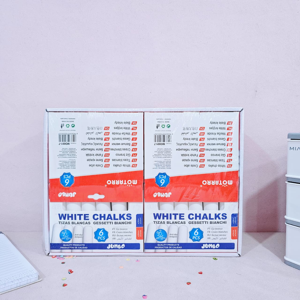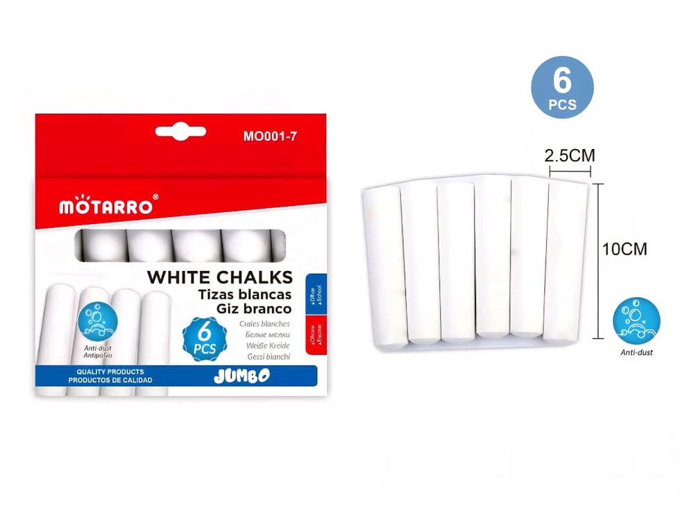 (Set de tizas de blancas de la marca Motarro, es antipolvo. Tizas gruesas y grandes, ideales para uso escolar y actividades artísticas. Dimensiones aproximadas de cada tiza: 10 cm de largo y 2.5 cm de diámetro).