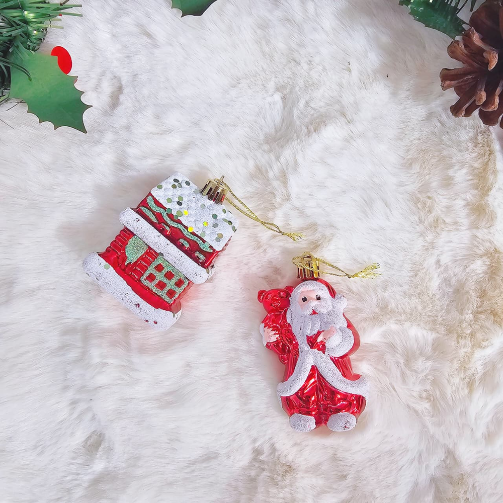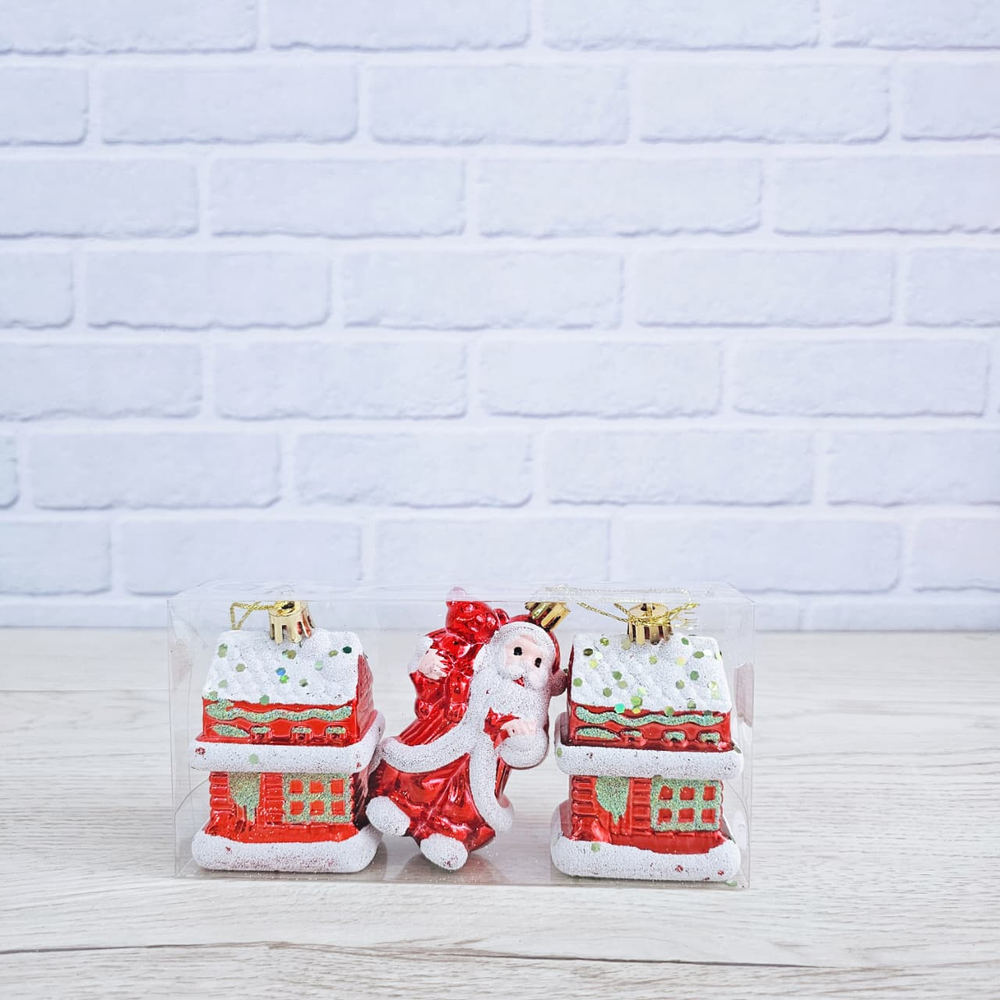 (Set x 3U. Adornos navideños en forma de Papá Noel y casitas navideñas en color rojo y blanco . Ideal para decorar tu arbolito)