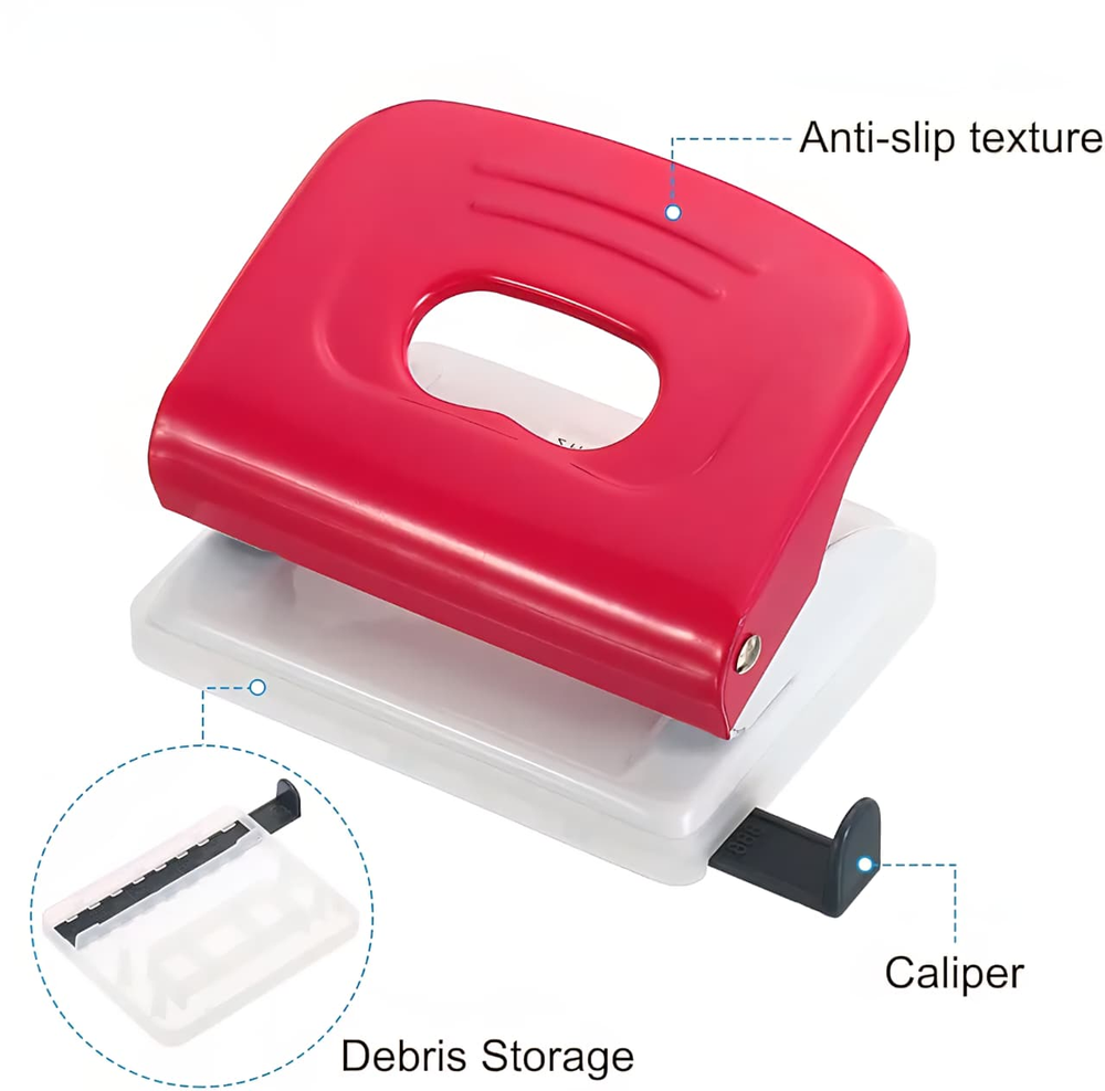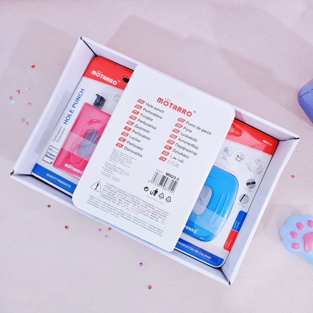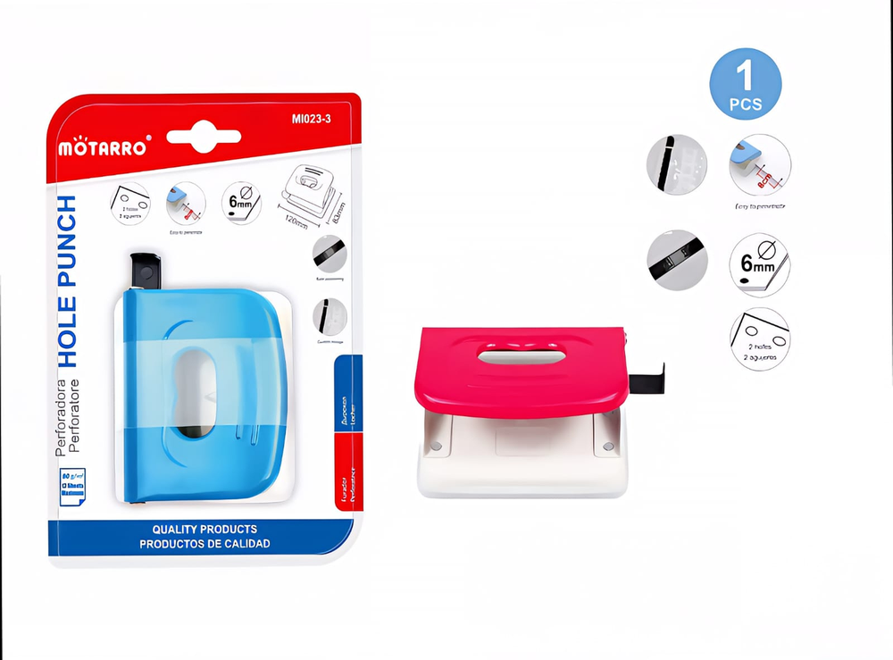 (Agujereadora de papel de la marca Motarro. Crea dos agujeros de 6 mm de diámetro. Está diseñada para perforar varias hojas a la vez. Disponible en dos colores: azul y rojo ).