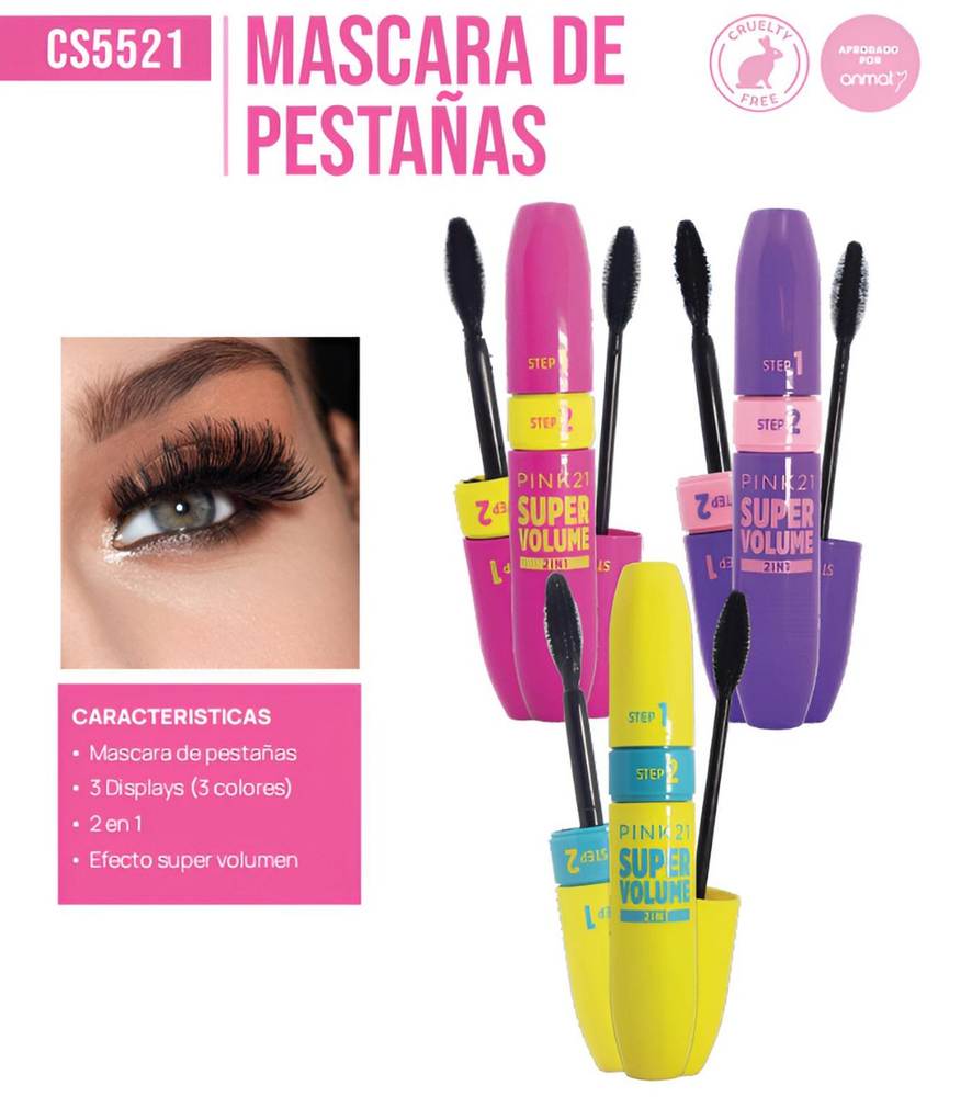 (Mascara para pestañas "Super Volumen" de Pink 21, disponible en 3 colores distintos de envase. La máscara es de color negro y tiene un diseño de dos pasos para su aplicación. Su fórmula está diseñada para dar volumen y definición a las pestañas).