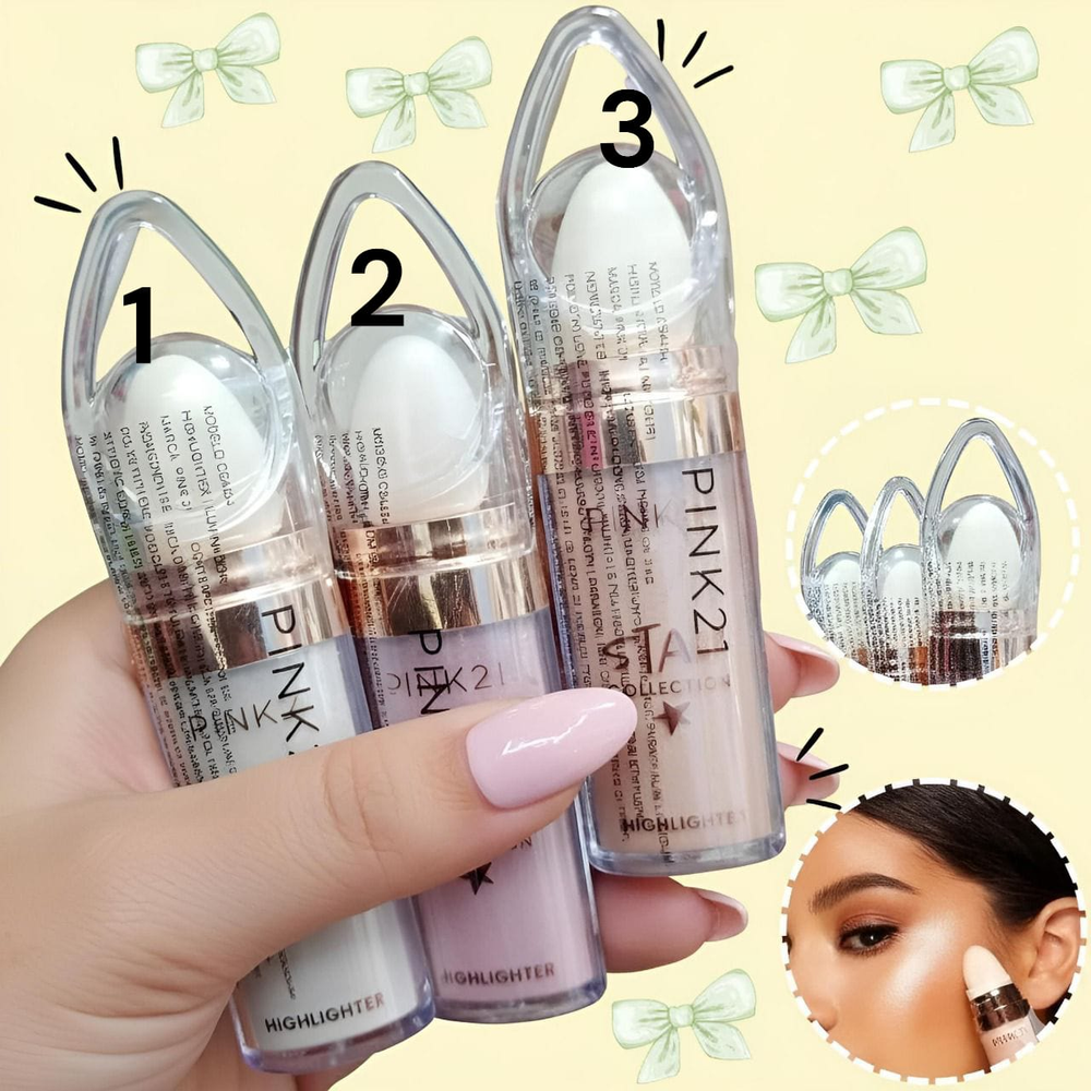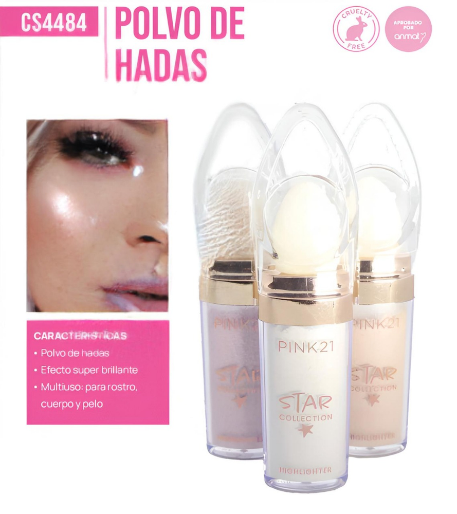 (Polvo de hadas ''PINK 21' iluminador multifuncional para rostro y cuerpo. Viene en un envase con una esponja en la punta para facilitar la aplicación. Se puede usar en el rostro, el cuerpo, el cabello e incluso sobre la ropa. Disponibles en 3 tonos: blanco, rosa o dorado).