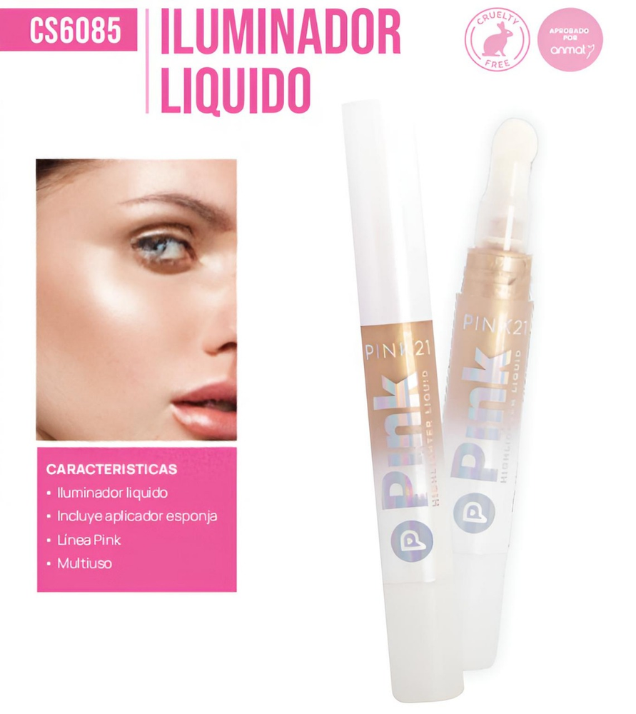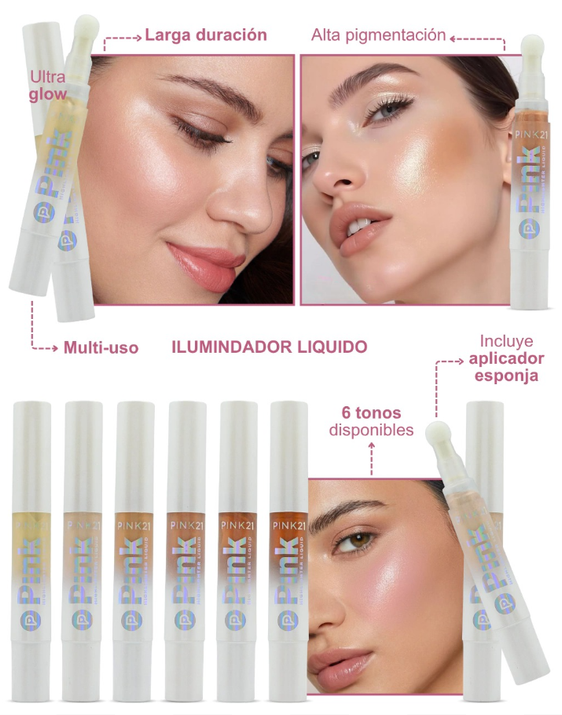 (Iluminador líquido de 6 tonos diferentes a elección para cualquier ocasión. Dejando un increíble brillo natural. Sirve para realzar la luminosidad natural del rostro y darle un acabado radiante. Su fórmula ligera y versátil permite aplicarlo en diversas zonas para resaltar y atraer la luz).