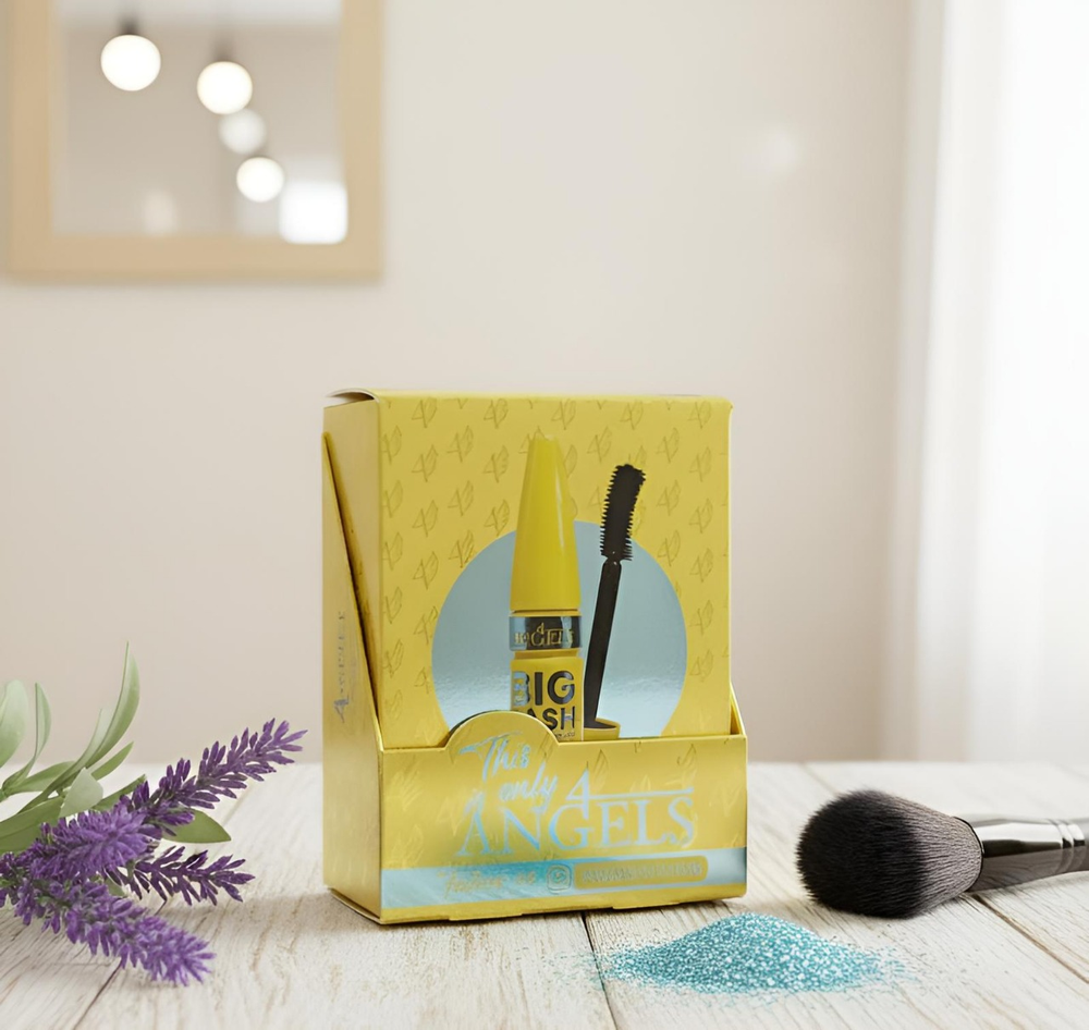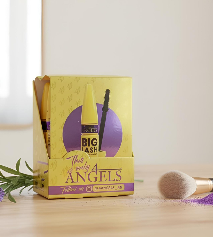 (Caja x 24U. Máscara de pestañas "4 Angels, que tiene un capacidad de alargar y definir tus pestañas dejándolas con volumen. Ideal para que no falte en tu maquillaje. Su tono es negro pero vienen en 2 colores de envase: amarillo con celeste o amarillo con violeta).