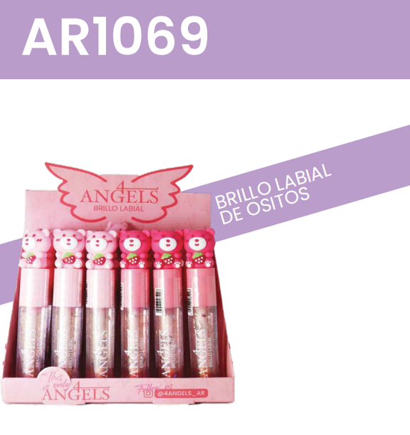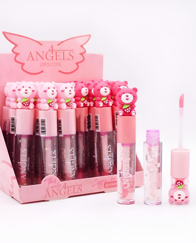 (Caja x24U. Brillo Labial "4 Angels". Este brillito cuenta con 2 opciones diferentes. Cada uno con un rico aroma frutal. Ideal para que tus labios brillen al natural).