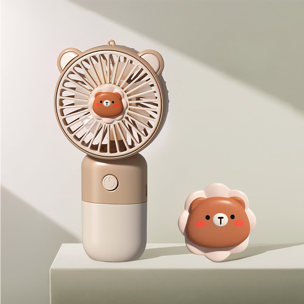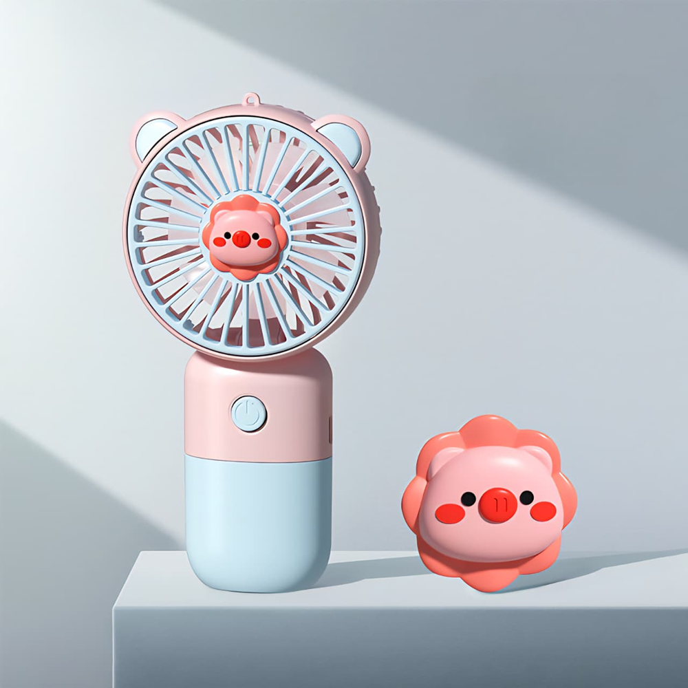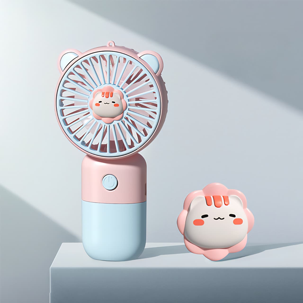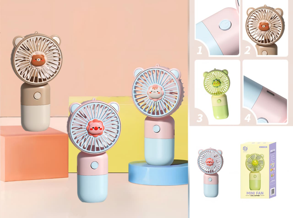 (Ventilador portátil que dispone de cable USB para carga. Boton de encendido/ apagado en la parte delantera)