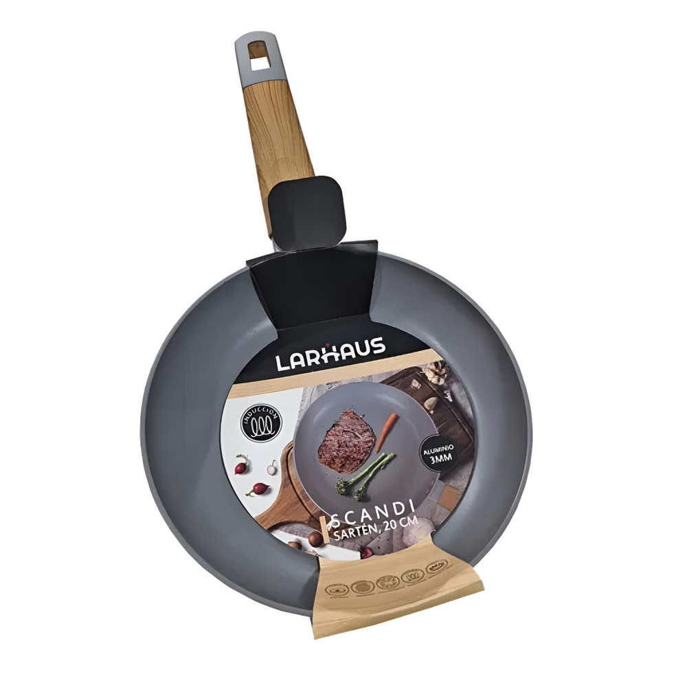 (Mango bakelita soft touch tipo madera, revestimiento interior antiadherente gris, superficie de coccion facil de limpiar).