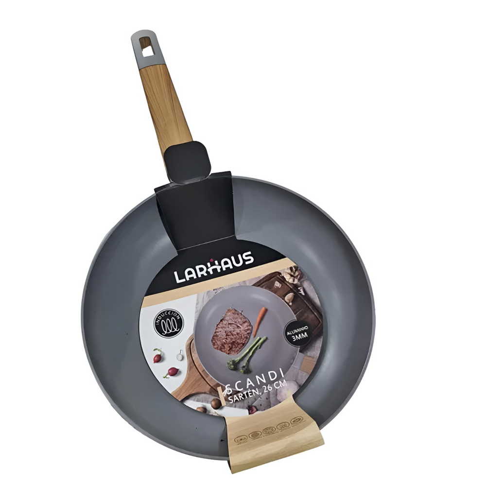 (Mango bakelita soft touch tipo madera, revestimiento interior antiadherente gris, superficie de coccion facil de limpiar).