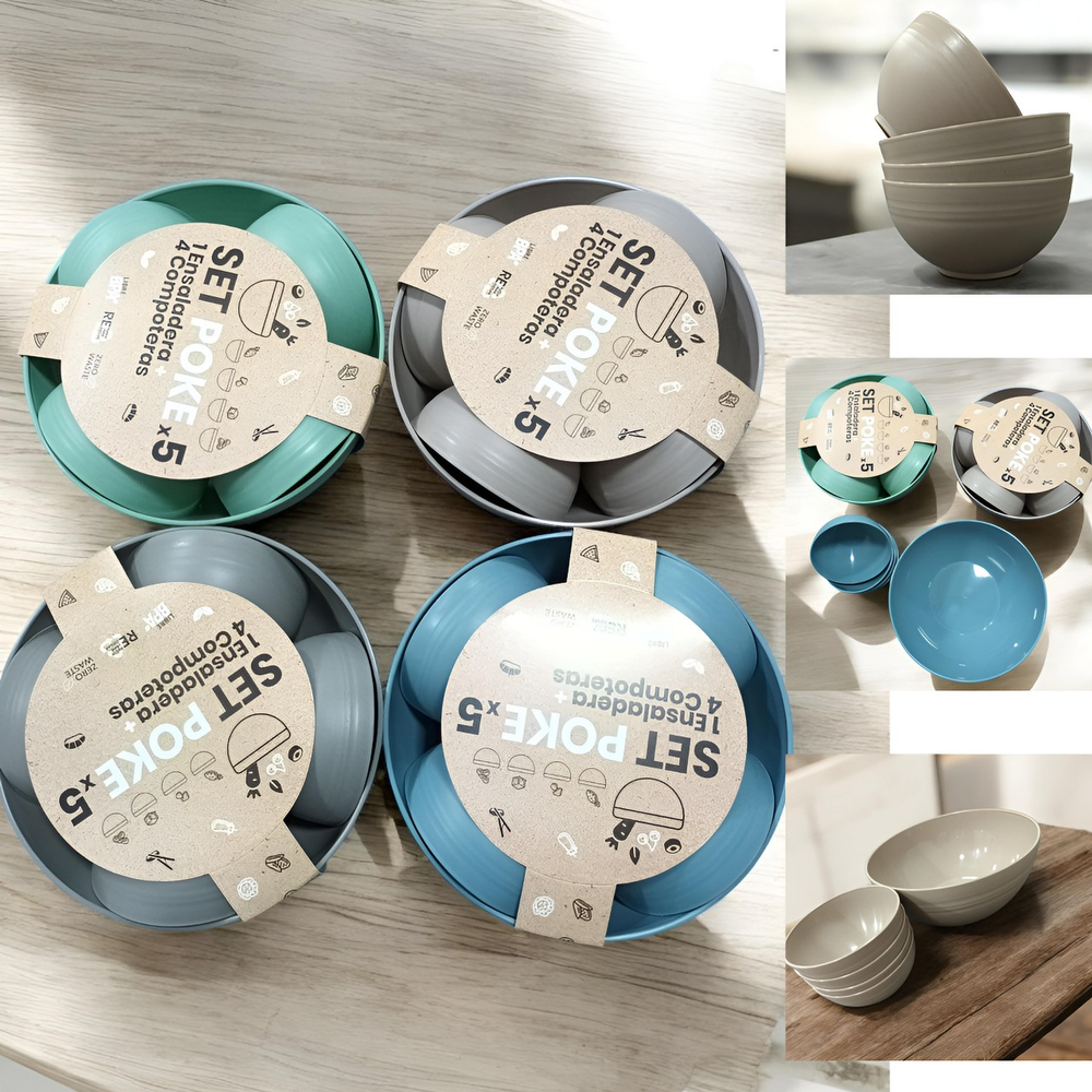 (El set incluye una ensaladera y cuatro compoteras, es libre de BPA y está hecho con materiales reciclados).