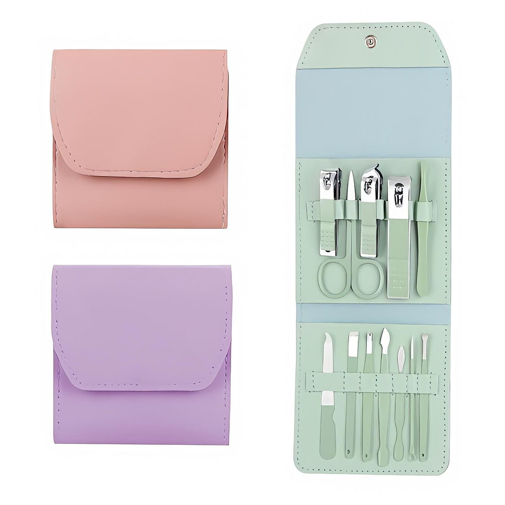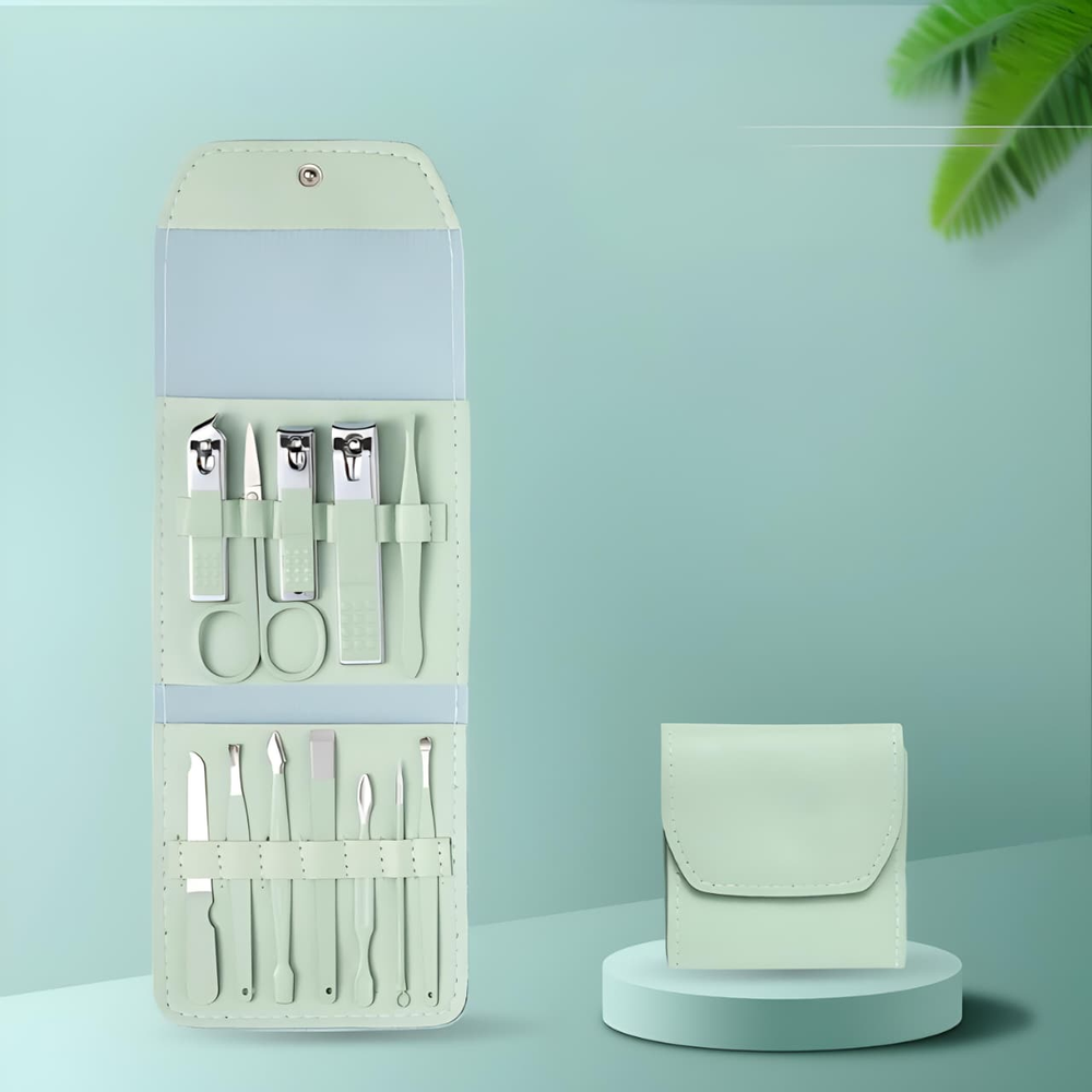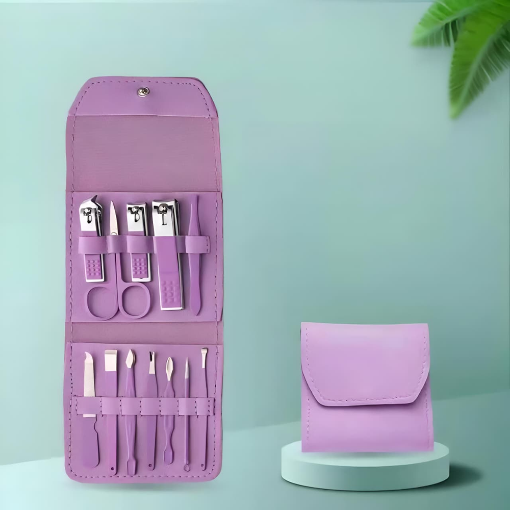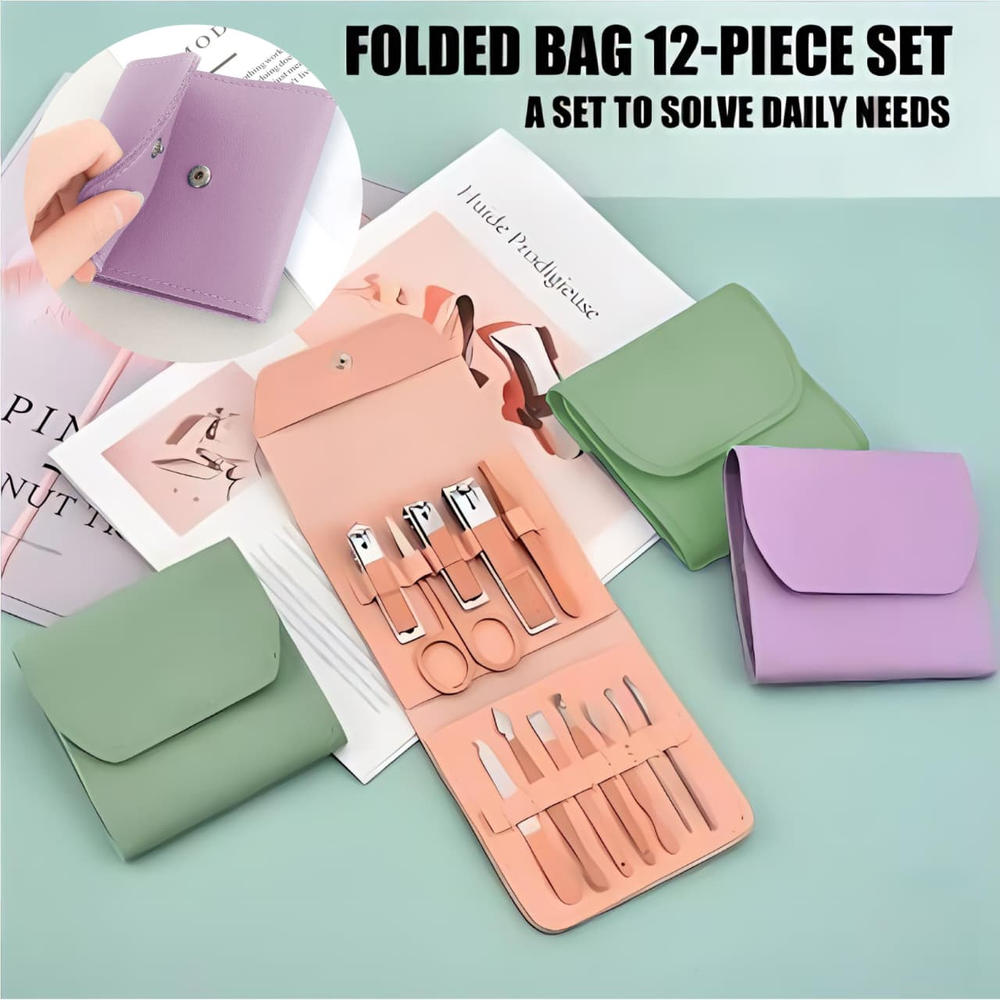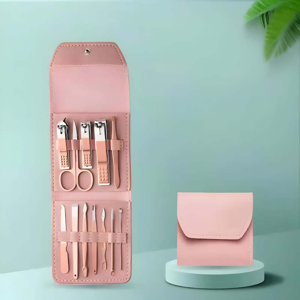 (Set de manicura de 12 piezas. Vienen en un estuche. Contiene 3 corta uñas, 1 tijera, 1 pinza para cejas, 1 limpiador de orejas, 1 aguja para acné, etc. Kit completo ideal para llevar de viaje).