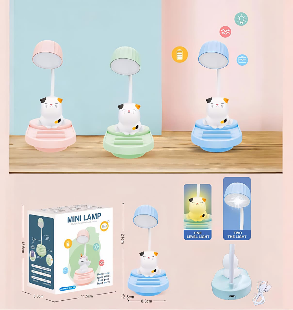 (Lámpara de escritorio con tres niveles de brillo, cuenta con un pequeño soporte para celular . Se carga a través de un cable USB (Incluido)).
