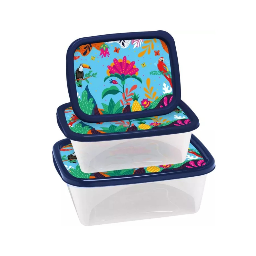 (Set de tres Tuppers de plástico rectangulares para almacenar alimentos. Los recipientes son transparentes, permitiendo ver el contenido. Son ideales para organizar la despensa, llevar almuerzos o guardar sobras).