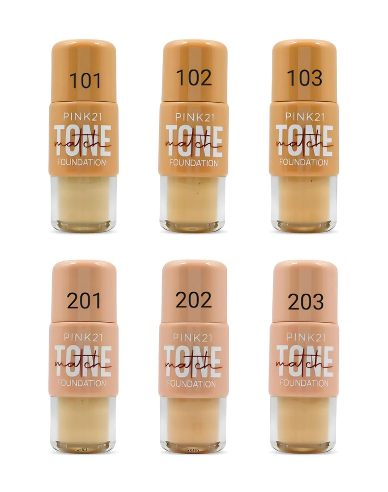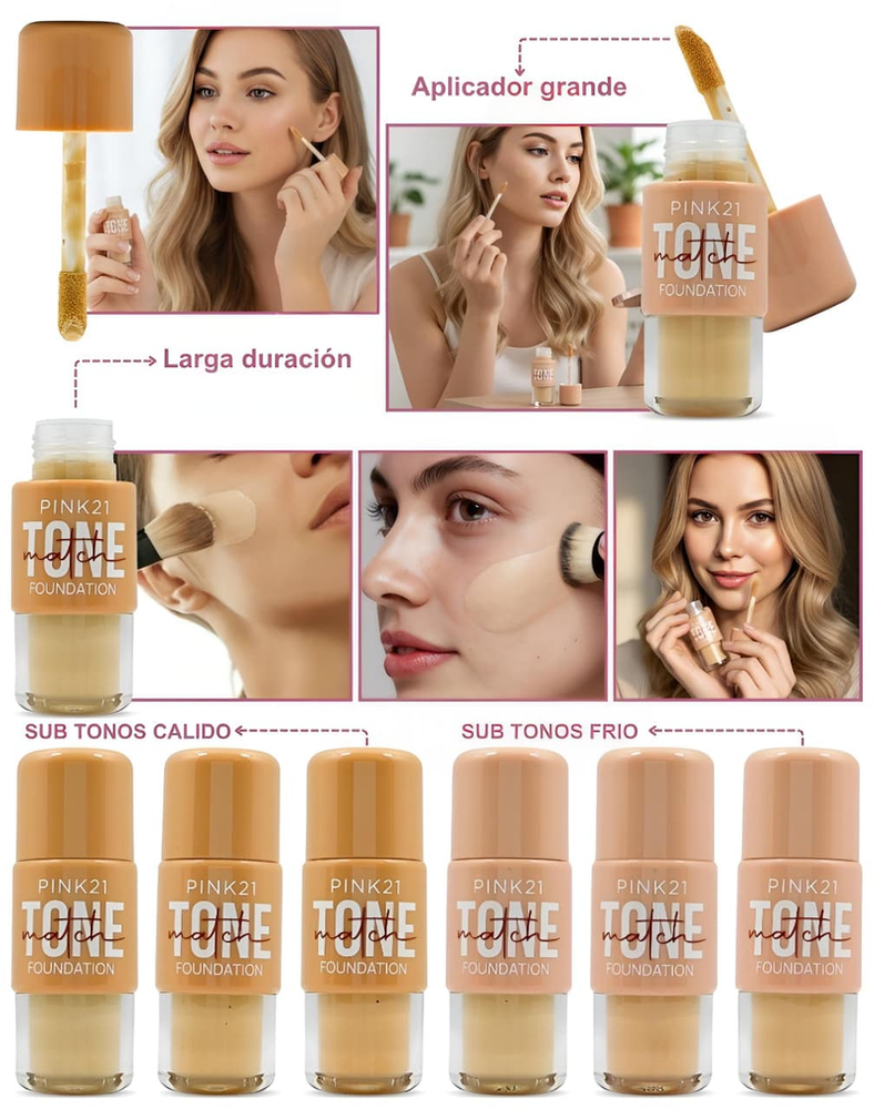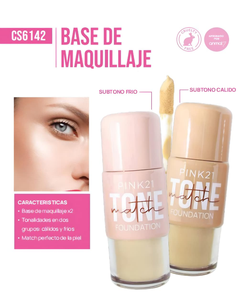 (Base de Maquillaje "Pink 21" con acabado mate suave y textura fluida que ofrece alta cobertura. 6 Tonos diferentes a elección).