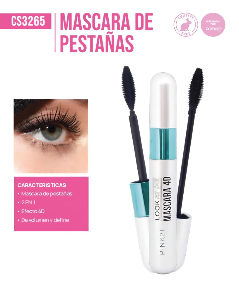 (Máscara de pestañas de Pink 21, un producto de maquillaje diseñado para definir, dar volumen y alargar las pestañas. La fórmula está diseñada para lograr pestañas con volumen, definición y alargamiento en una sola aplicación, evitando grumos con efecto 4D).