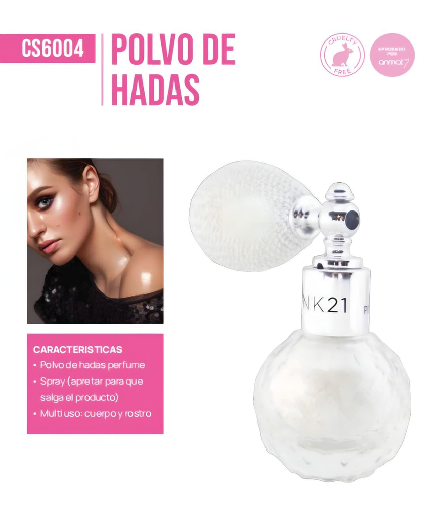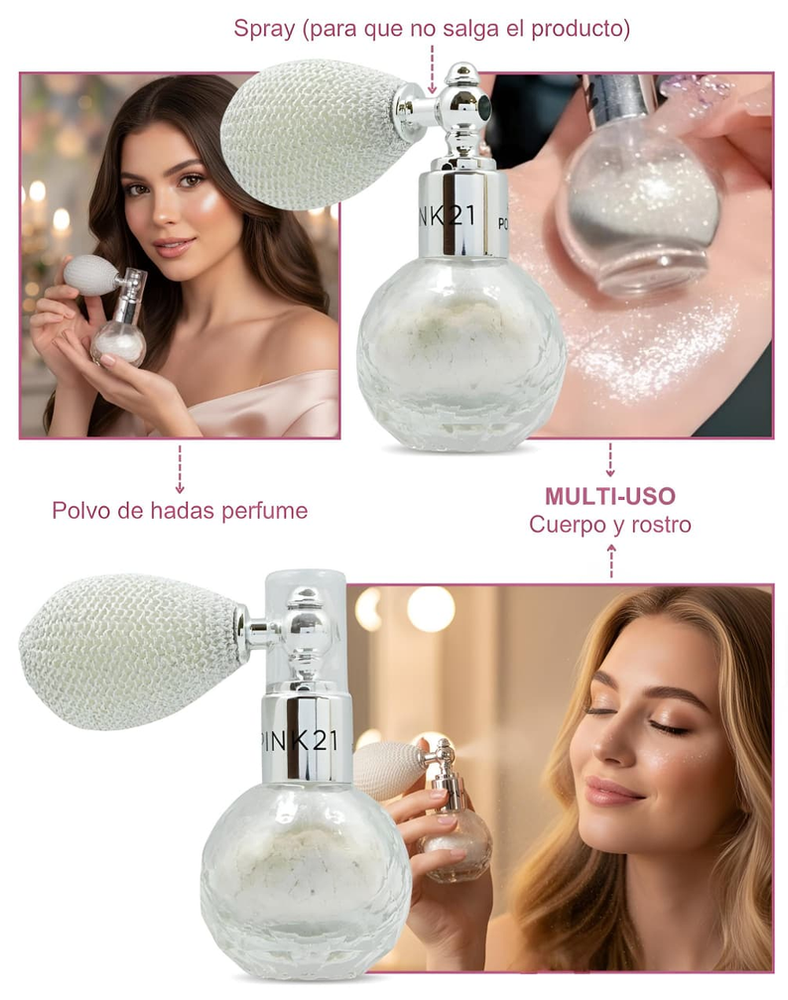 (Polvo de hadas presentación tipo perfume spray, ideal para rostro y cuerpo).