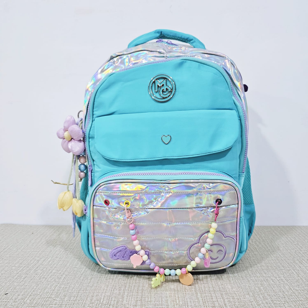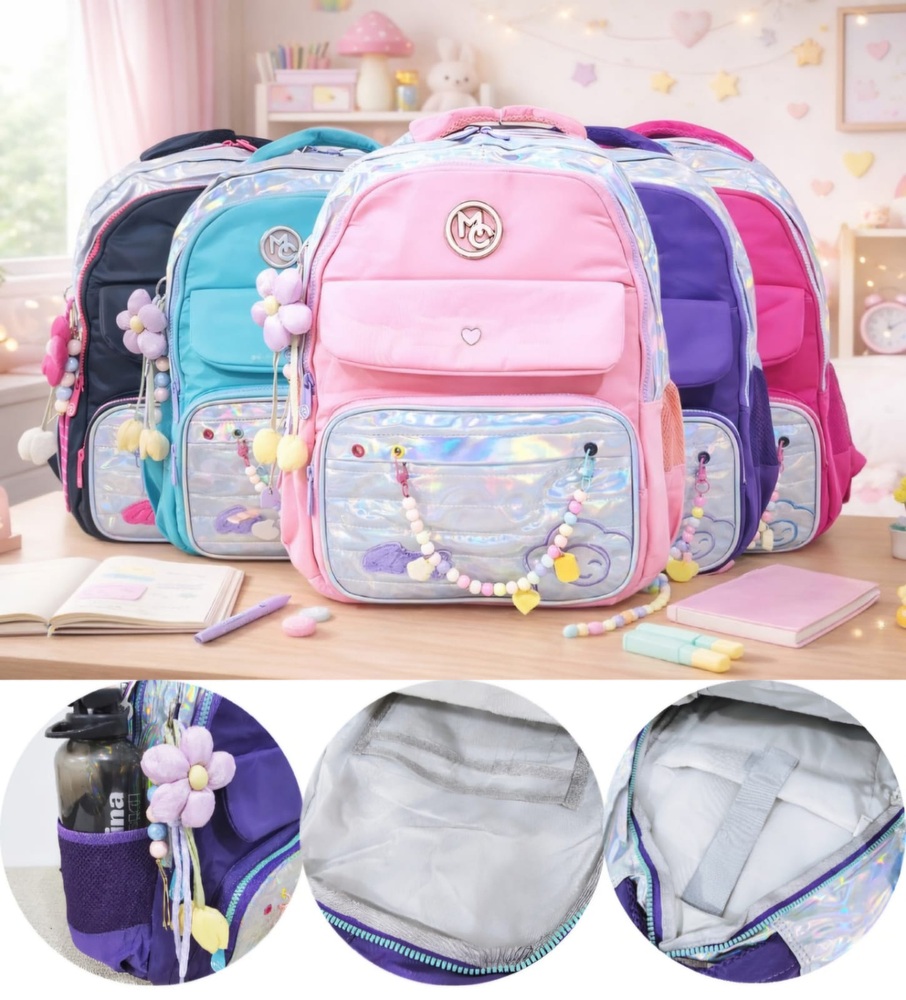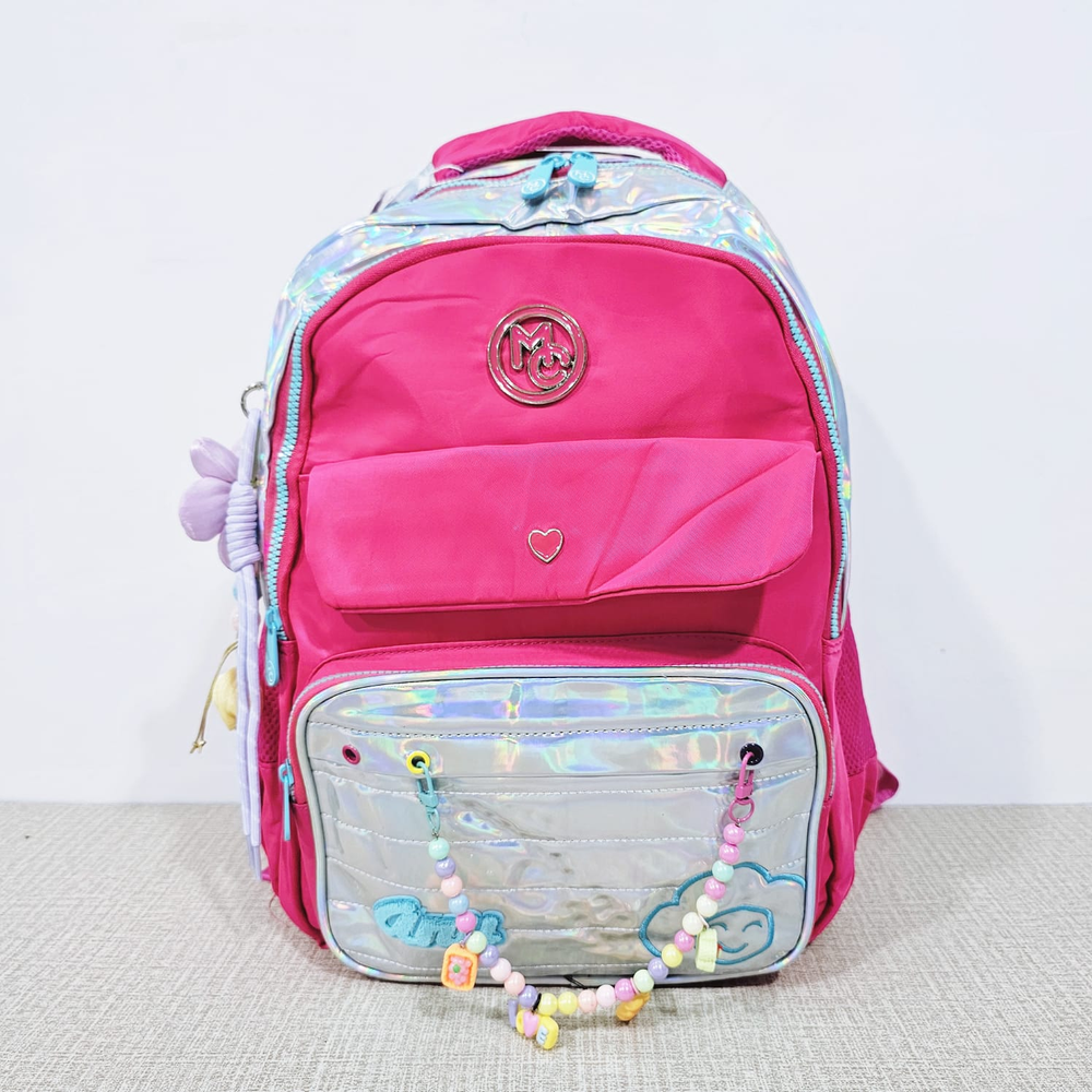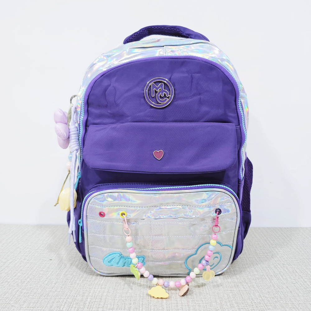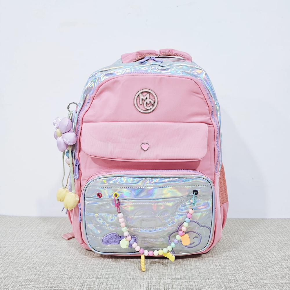 (Mochila infantil amplia con diseño metalizado, cuenta con dos bolsillos delanteros, compartimentos laterales e internos y un hermoso llavero en forma de flor. Ideal para el nuevo ciclo escolar).