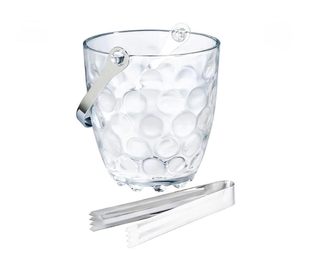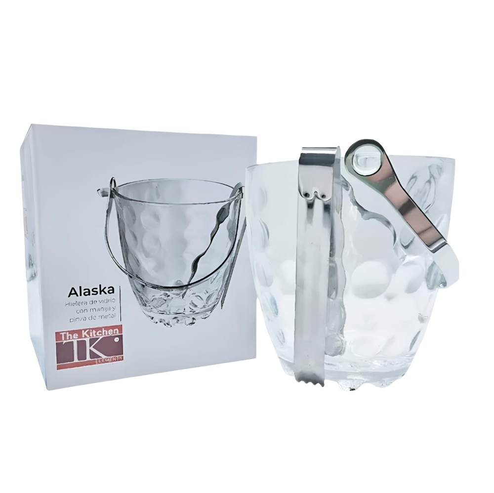 (Hielera de vidrio con manija y pinza de metal).