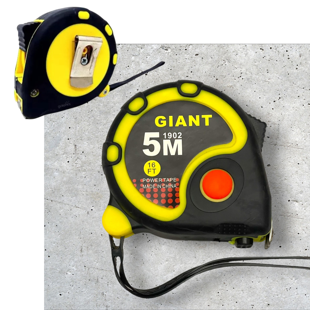 (Cinta métrica de 5M, superficie de goma y cinta de acero; posee botón de traba y manija para un mejor transporte).