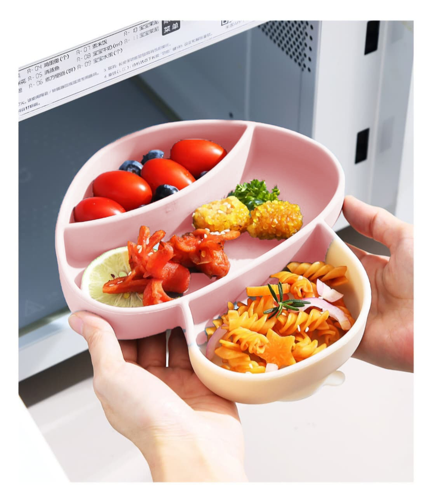 (Set de alimentación de silicona para bebés. Incluye varias piezas, como plato, cubiertos y un sorbete para sopa. Cuenta con un diseño de ventosa grande que lo fija firmemente a la mesa, lo que garantiza que los niños no puedan empujarlo ni volcarlo mientras comen. Está fabricado con silicona de grado alimenticio, libre de BPA).