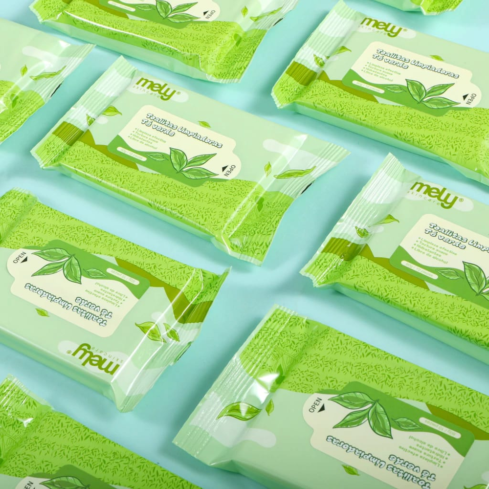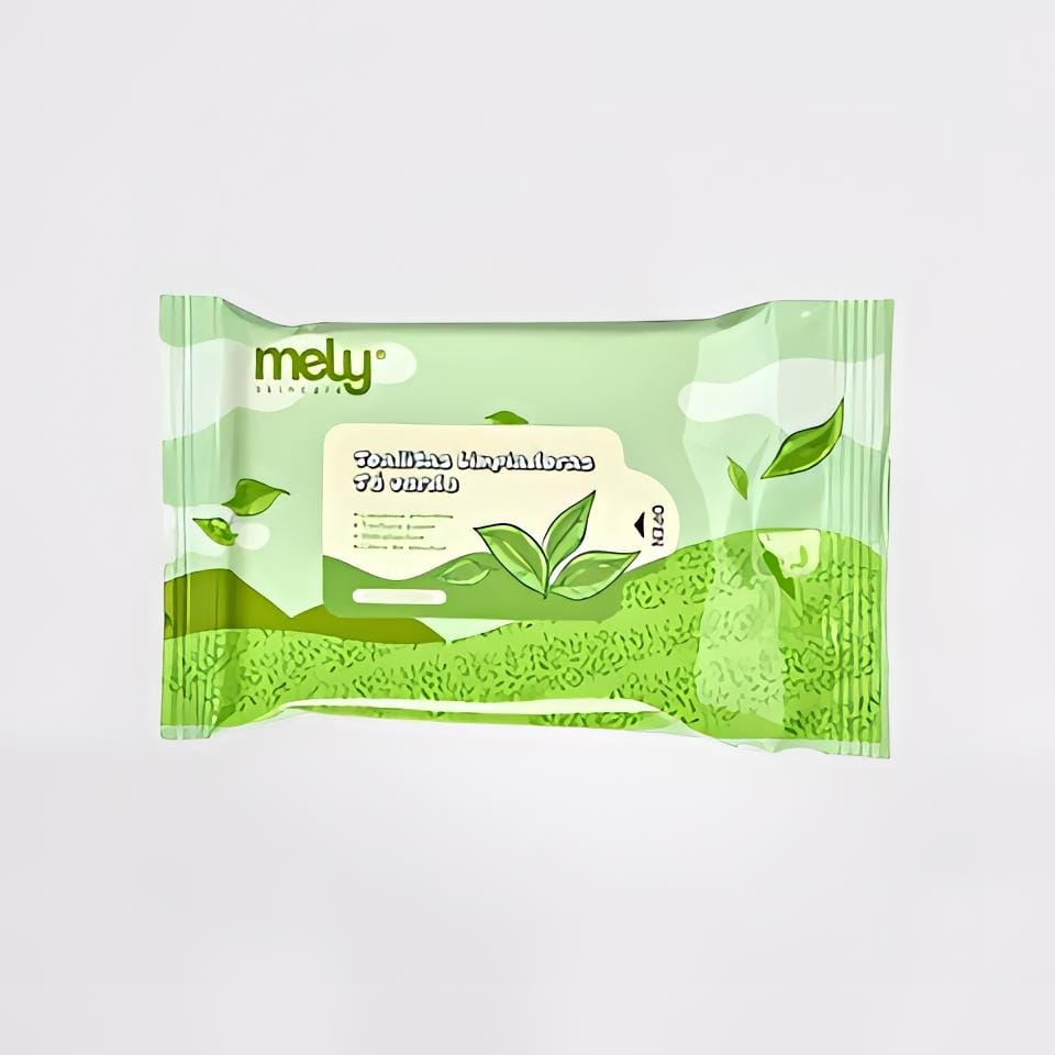 (Toallitas Desmaquillantes de té verde "Mely". Estas toallitas contienen 10 de ellas Ideales para desmaquillar y cuidar tu piel dándote hidratación).