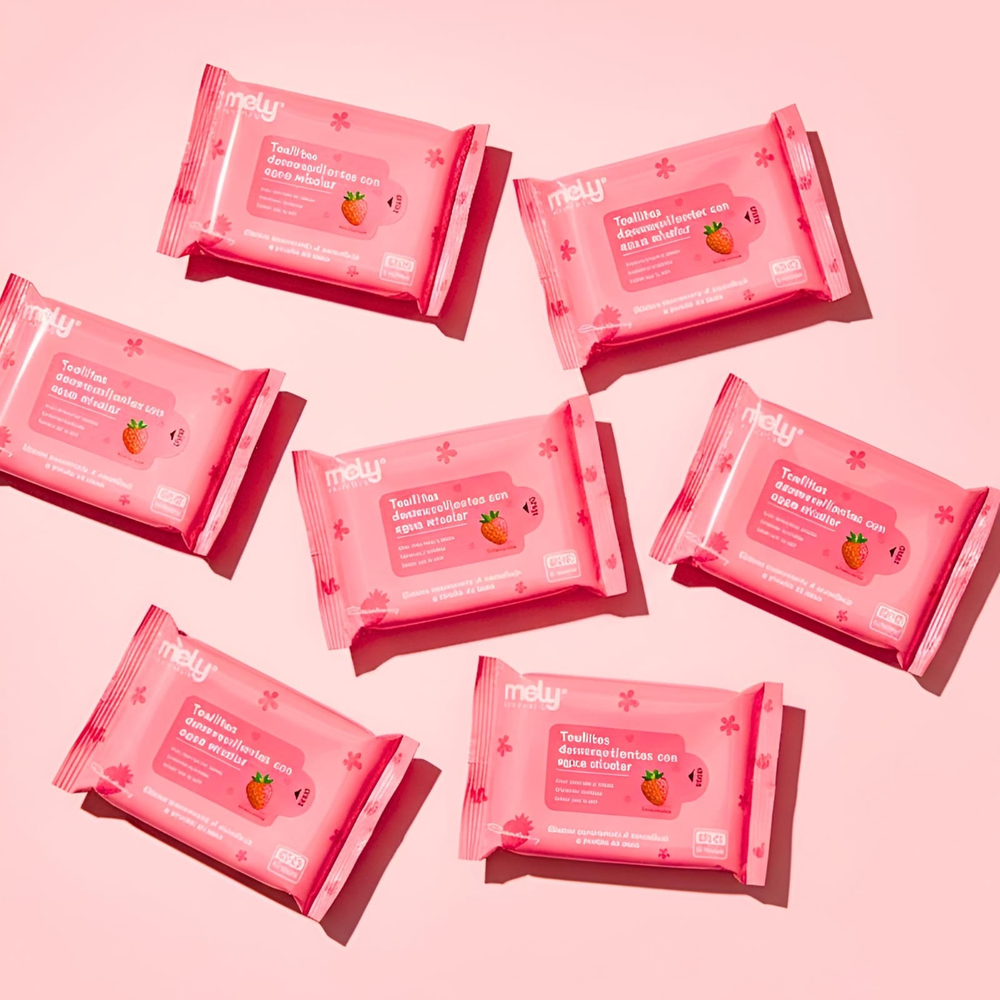 (Toallitas Desmaquillantes de Frutilla "Mely". Estas toallitas contienen 10 de ellas Ideales para desmaquillar y cuidar tu piel dándote hidratación).