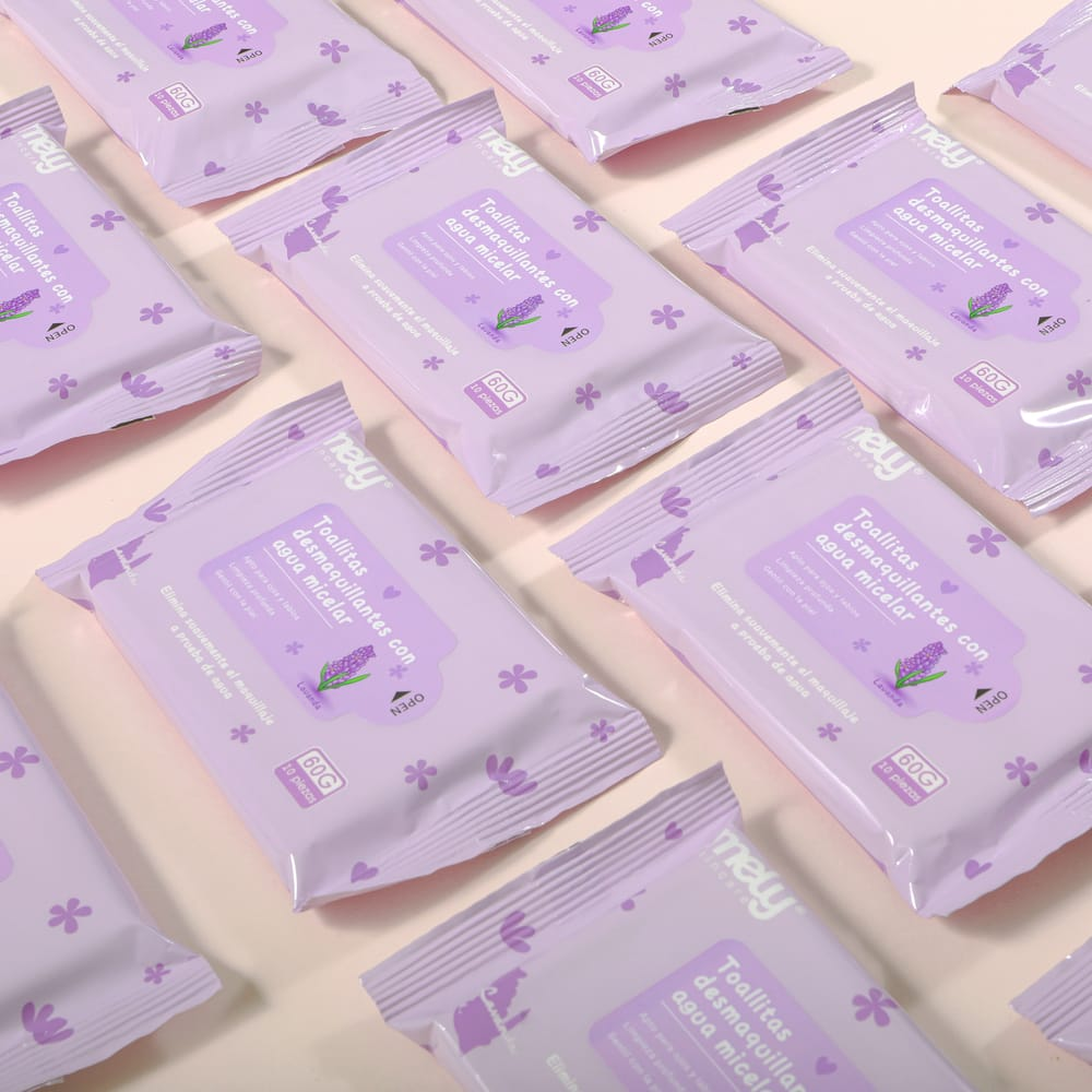 (Toallitas Desmaquillantes de Lavanda "Mely". Estas toallitas contienen 10 de ellas Ideales para desmaquillar y cuidar tu piel dándote hidratación).