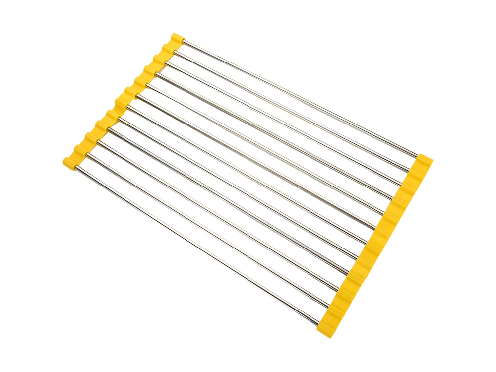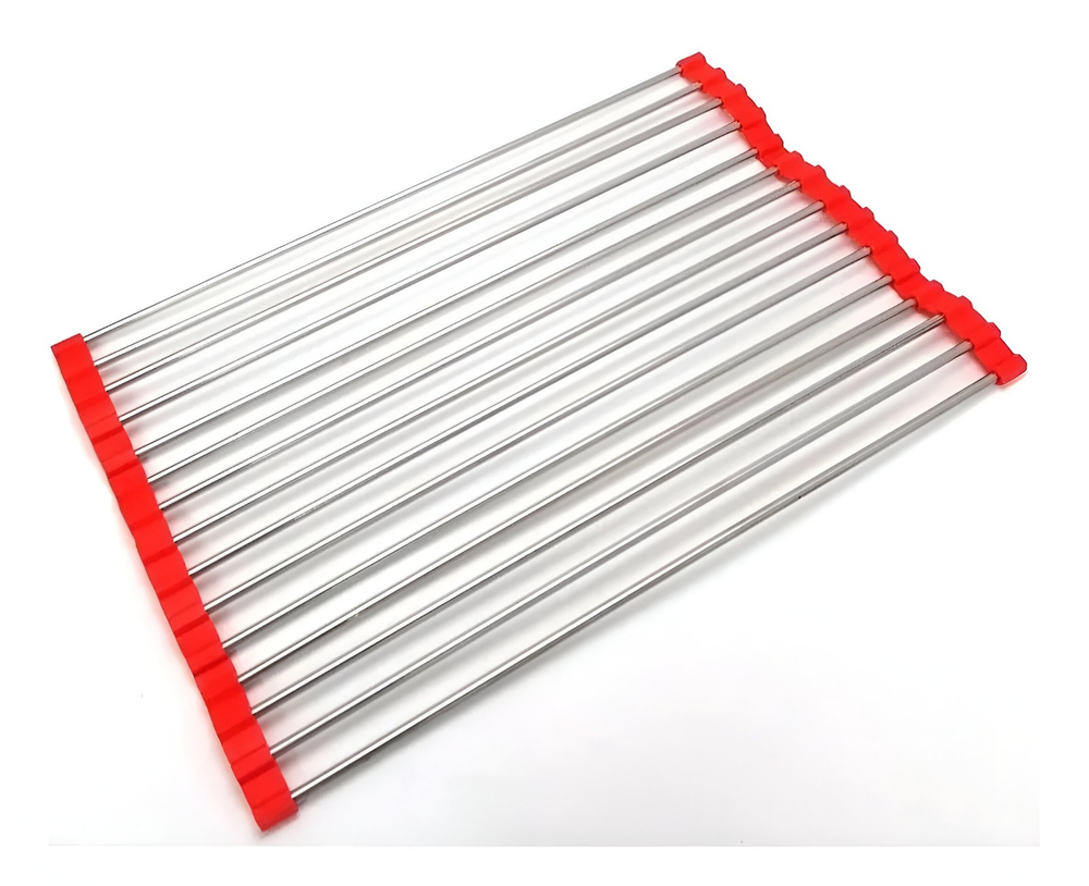 (Fabricado con varillas de acero inoxidable y bordes de silicona. Su diseño permite enrollarlo fácilmente para un almacenamiento compacto, ideal para optimizar el espacio en cocinas pequeñas. Además de escurridor de platos, vasos y cubiertos, funciona como rejilla para lavar frutas y verduras sobre el fregadero).