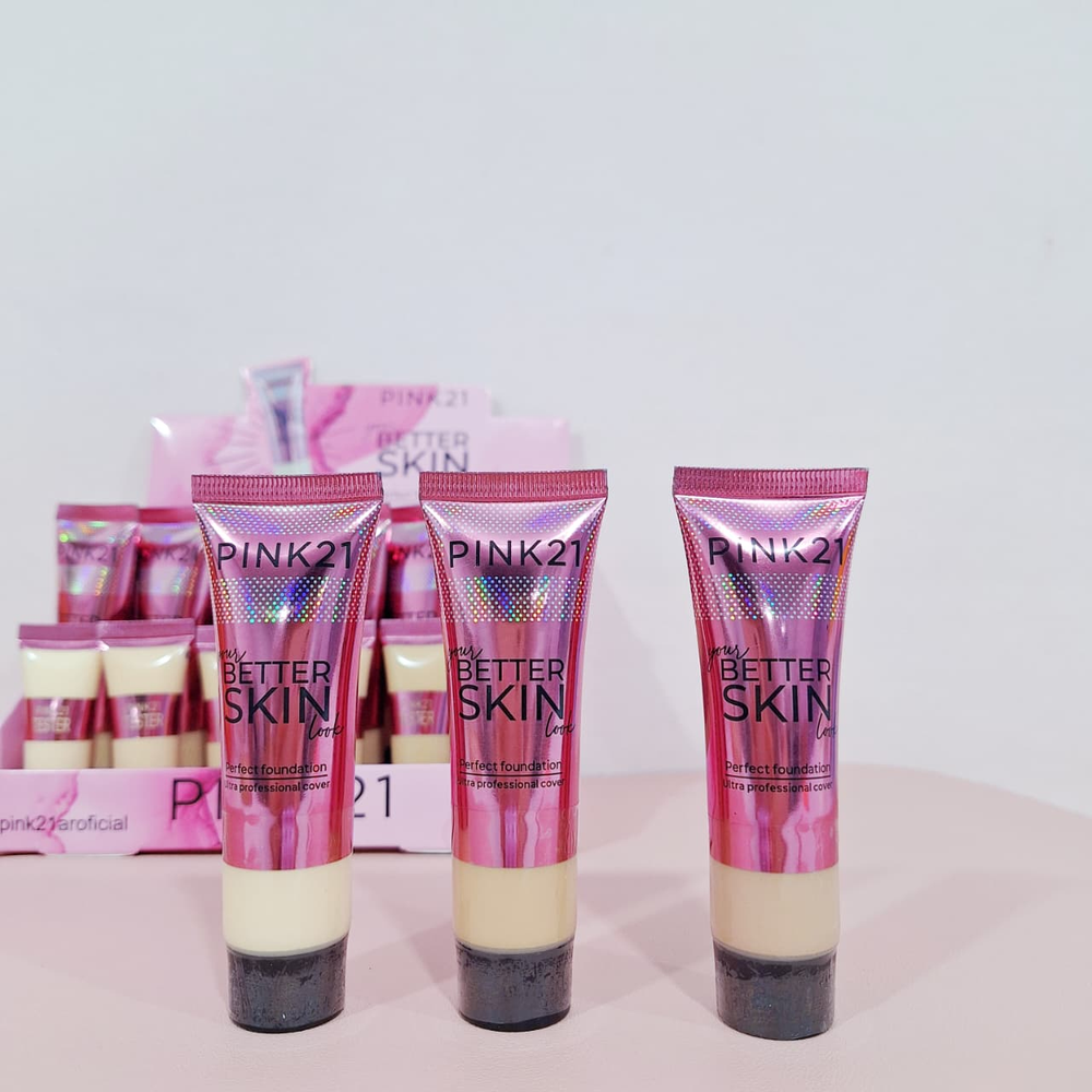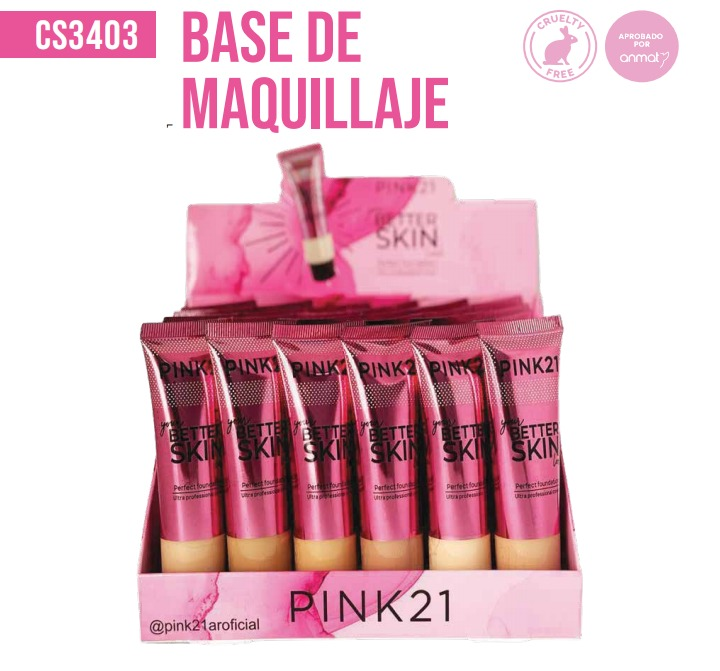 (Base de Maquillaje "Pink 21" con acabado mate suave y textura fluida que ofrece alta cobertura. 6 Tonos diferentes a elección).
