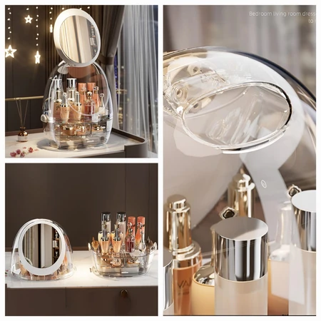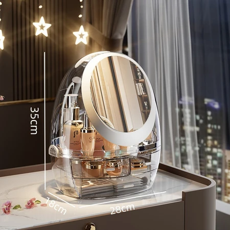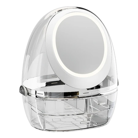 (Cuenta con 3 cajones transparentes, un compartimento principal desmontable y un espejo táctil con luz led. Ideal para organizar tu escritorio).con tapa de madera, cierre hermético a presión. Cuenta con un diseño en relieve)