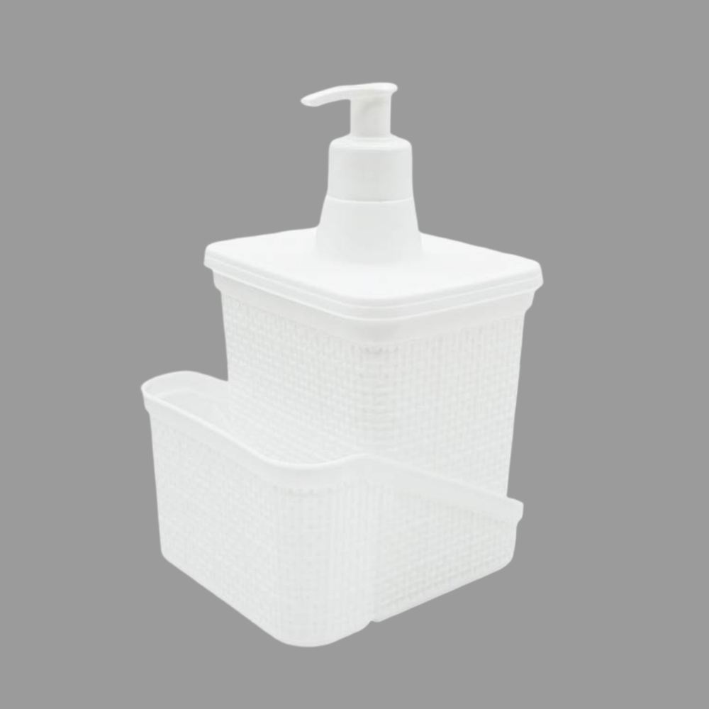 (Combina un dispensador para jabón o detergente con un espacio para organizar otros elementos como esponjas, cepillos o utensilios. Esta hecho en plástico, es liviano y resistente).