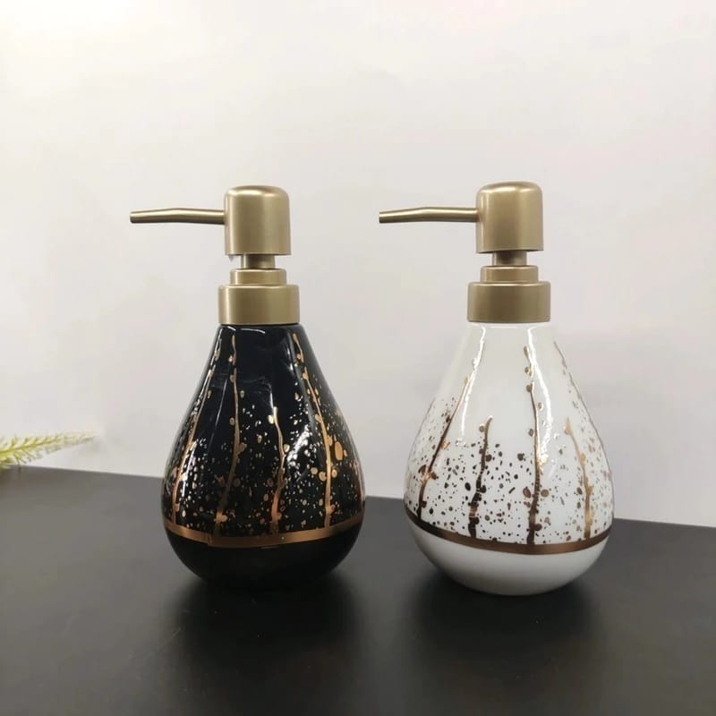 (Dispenser de cerámica para jabón liquido. Excelente calidad y terminación. Diseño salpicado en dorado).