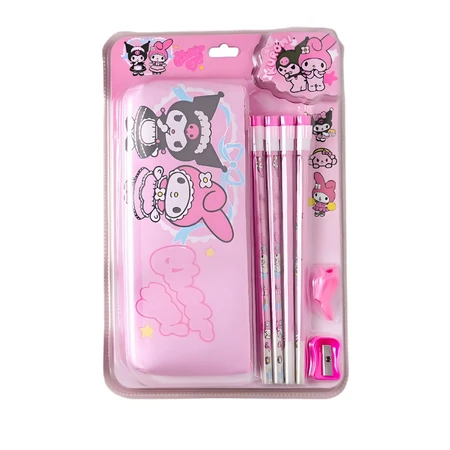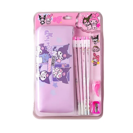(Set de útiles con temática de personajes "Sanrio". Cada set cuenta con cuatro lápices, una cartuchera y un sacapuntas. Ideal para uso escolar y regalar).