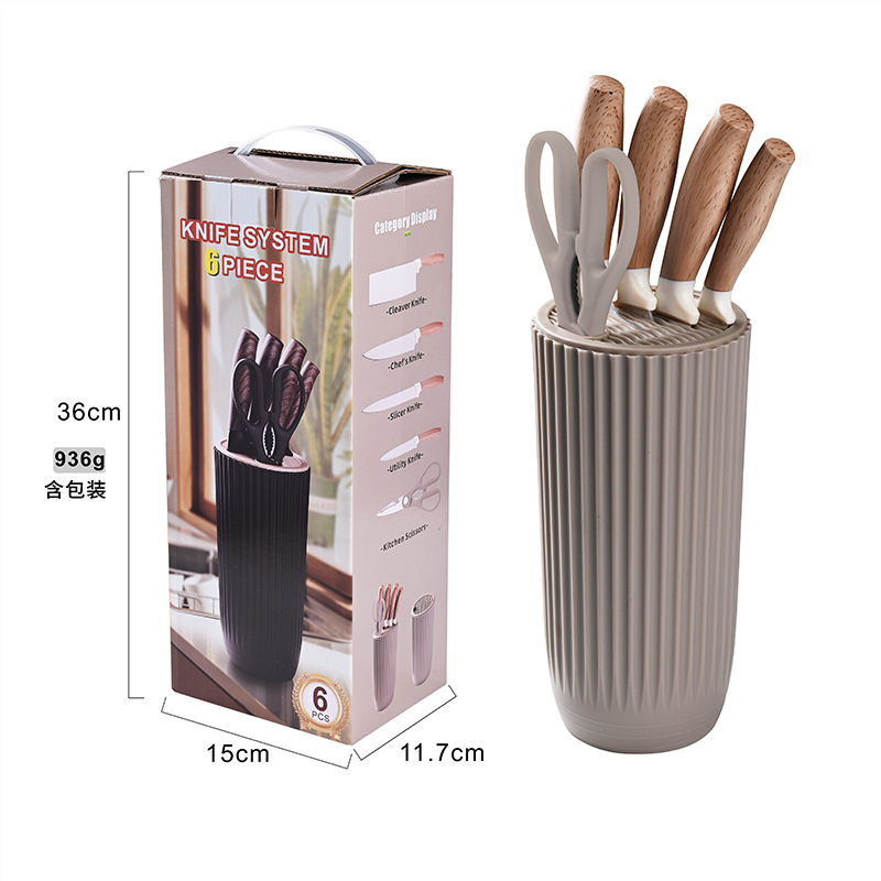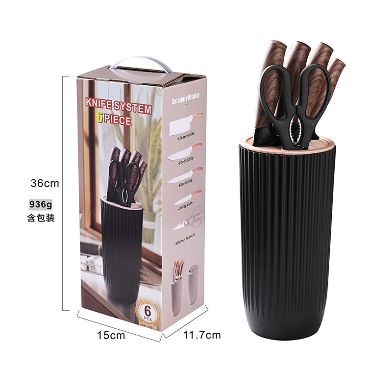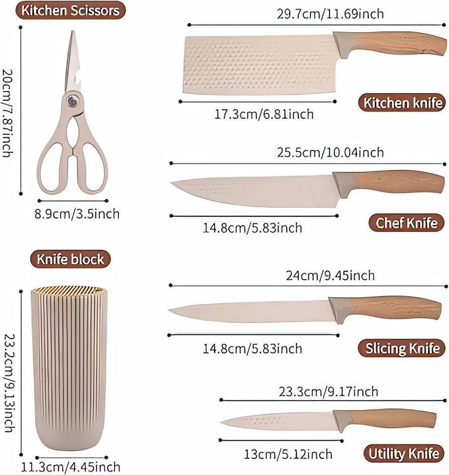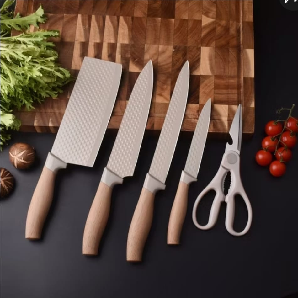 (Hermoso set profesional de utensilios de cocina. Resistente a altas temperaturas. Diseñado para no doblarse. Este set contiene: cuchillo de carnicero + cuchillo de cocinero + cuchillo rebanador + cuchillo utilitario + tijeras de cocina).