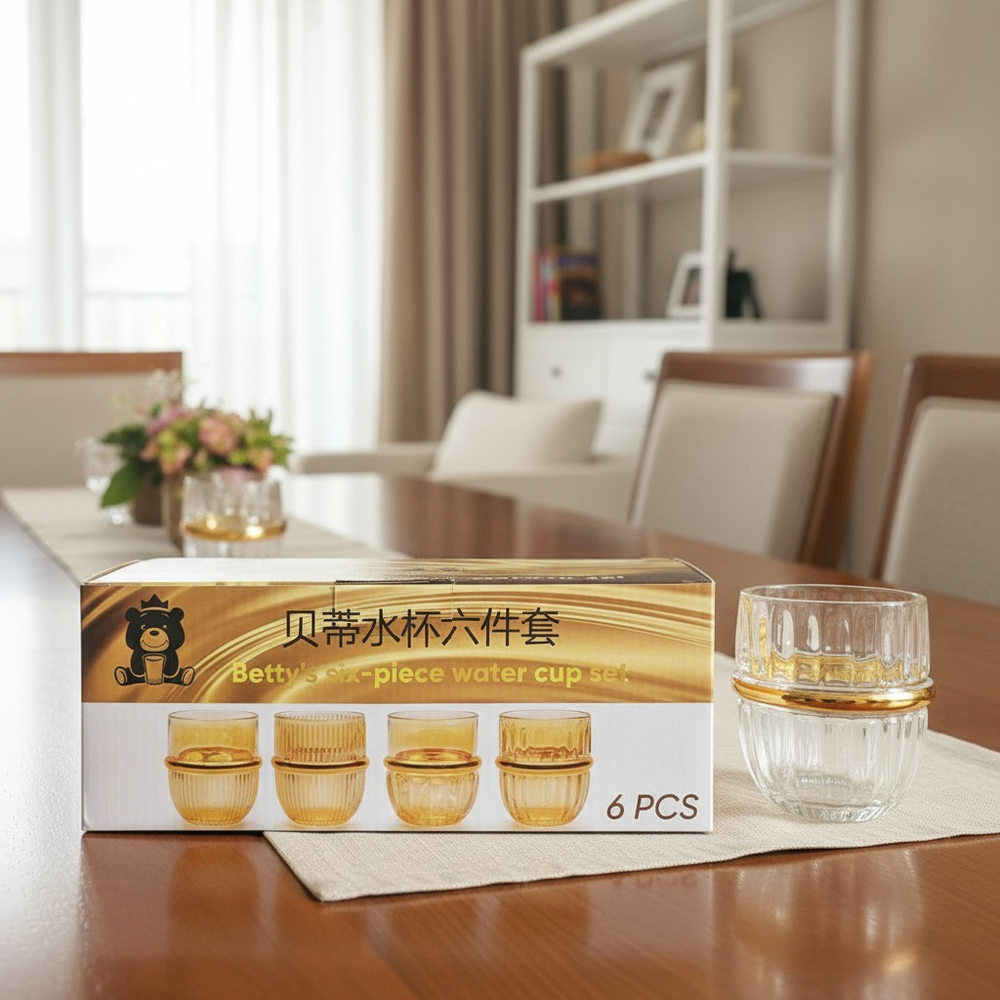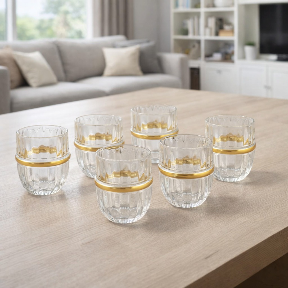 (Juego de 6 vasos de vidrio con detalles en dorado)
