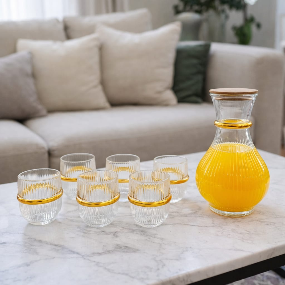 (Presenta un diseño de vidrio transparente con rayas verticales y detalles dorados. Ideal para reuniones y eventos. La jarra cuenta con una tapa de madera).
