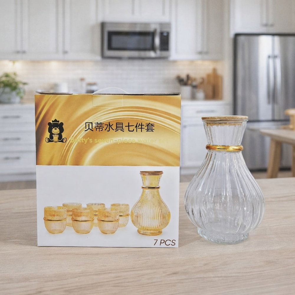 (Presenta un diseño de vidrio transparente acanalado con detalles dorados. y detalles dorados. Ideal para reuniones y eventos. Incluye jarra con tapa de madera y 6 vasos ).