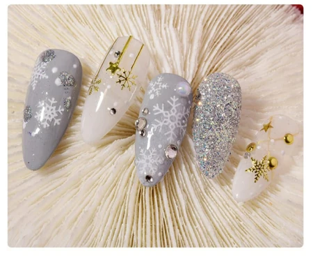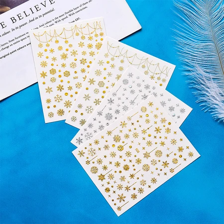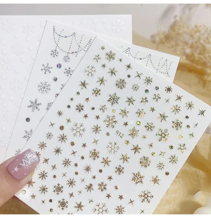 (3 x 1 en blíster de Stickers para uñas en diversos diseños de copitos de nieves. Variedades de colores plateado y dorados).