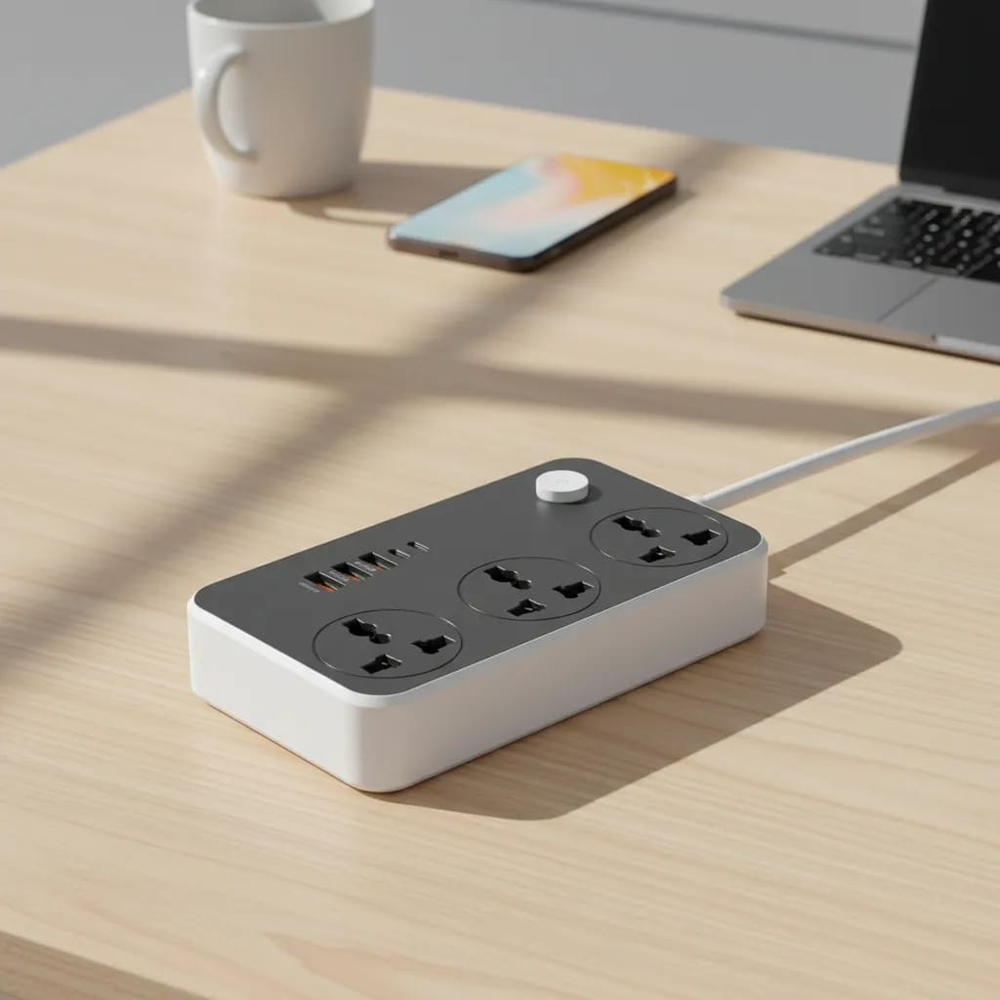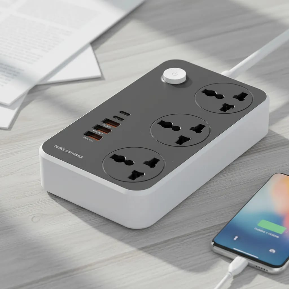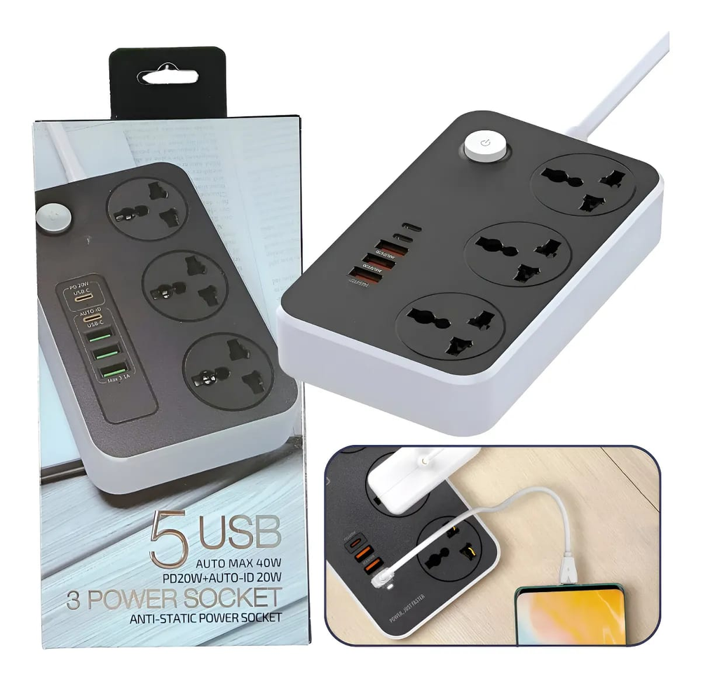 (Cuenta con 3 enchufes universales, 3 puertos USB y 2 puertos con ficha tipo C. Además, cuenta con un botón encendido/apagado de seguridad. Ideal para celulares, televisores, computadoras, parlantes, etc).