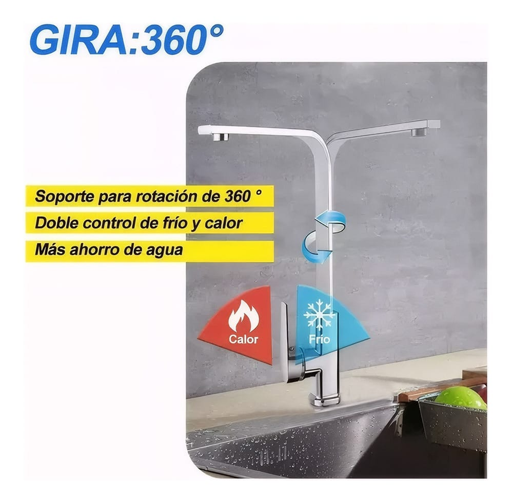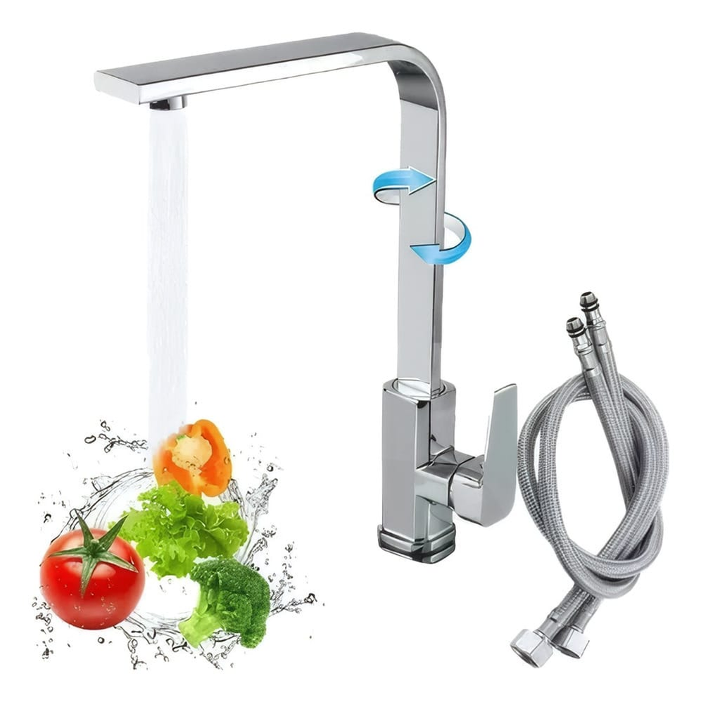 (Canilla monocomando recta 90°. Pico giratorio 360°. Posee pico aireador, el mismo sirve para evitar salpicaduras y a su vez ayuda al ahorro de agua. Viene lista para instalar, incluye dos flexibles de acero inoxidable más kit de fijación).