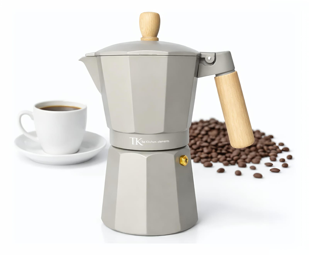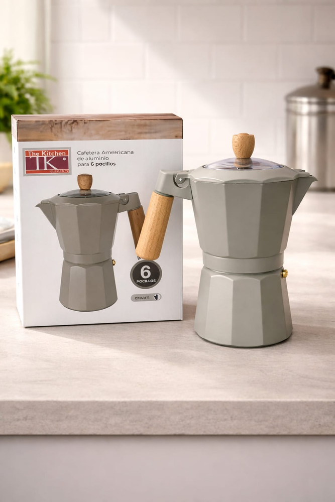 (Cafetera Italiana " The Kitchen" cuenta con una estructura de aluminio que permite distribuir el calor de manera uniforme, logrando una preparación pareja y eficiente. Su mango con acabado simil madera aporta seguridad al servir y un estilo moderno que queda perfecto en cualquier cocina. Funciona en cocina a gas, eléctrica y vitrocerámica. Capacidad: 300 CC. aprox.).