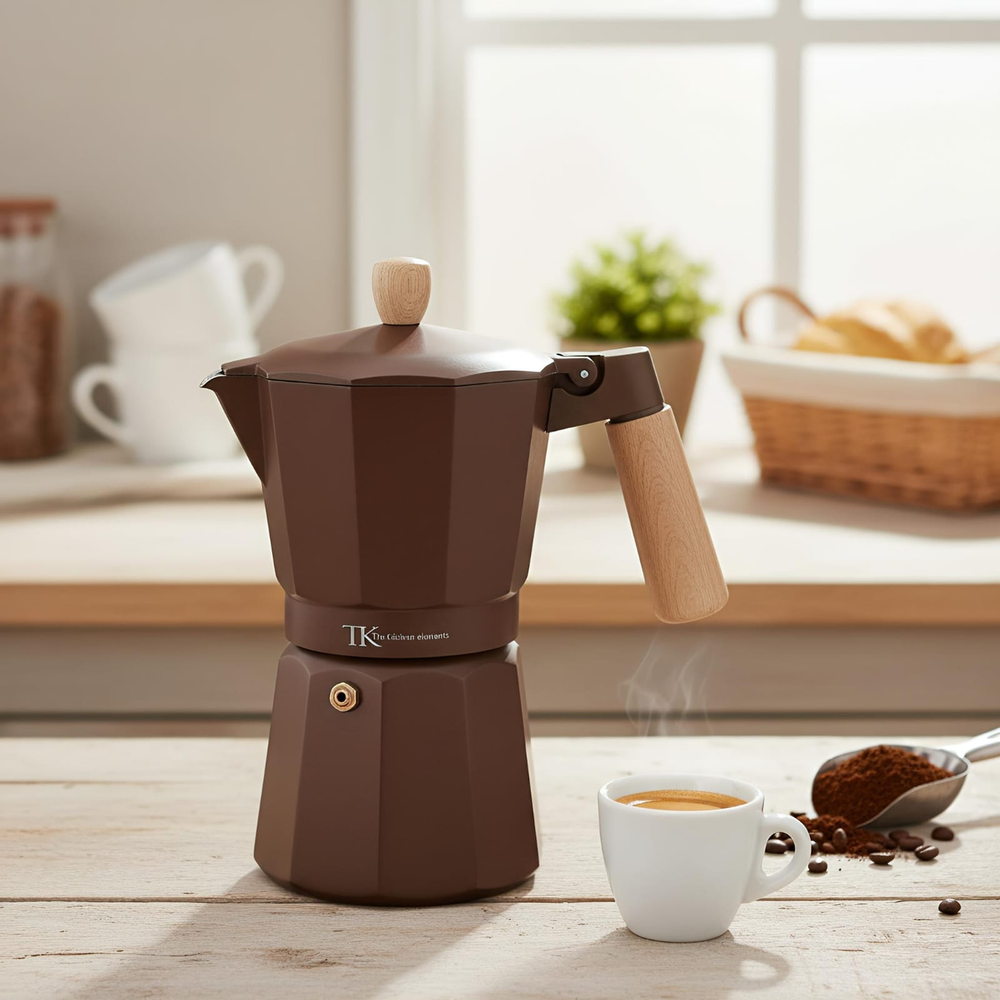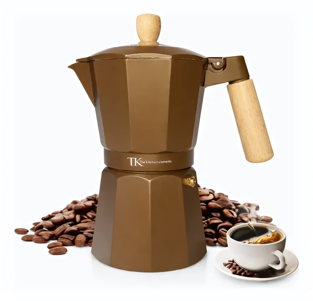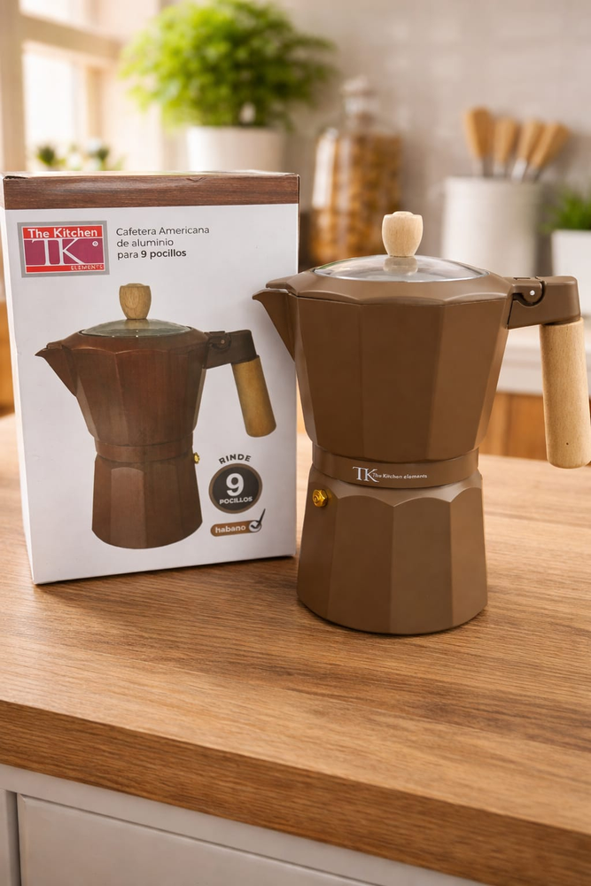 (Cafetera Italiana " The Kitchen" cuenta con una estructura de aluminio que permite distribuir el calor de manera uniforme, logrando una preparación pareja y eficiente. Su mango con acabado simil madera aporta seguridad al servir y un estilo moderno que queda perfecto en cualquier cocina. Funciona en cocina a gas, eléctrica y vitrocerámica).