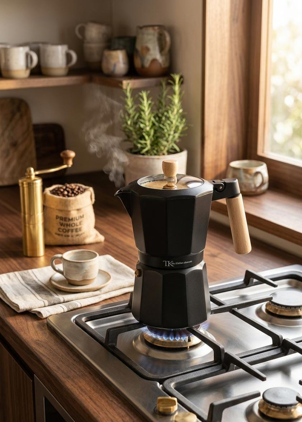 (Cafetera Italiana " The Kitchen" cuenta con una estructura de aluminio que permite distribuir el calor de manera uniforme, logrando una preparación pareja y eficiente. Su mango con acabado simil madera aporta seguridad al servir y un estilo moderno que queda perfecto en cualquier cocina. Funciona en cocina a gas, eléctrica y vitrocerámica).