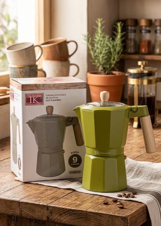 (Cafetera Italiana " The Kitchen" cuenta con una estructura de aluminio que permite distribuir el calor de manera uniforme, logrando una preparación pareja y eficiente. Su mango con acabado simil madera aporta seguridad al servir y un estilo moderno que queda perfecto en cualquier cocina. Funciona en cocina a gas, eléctrica y vitrocerámica).