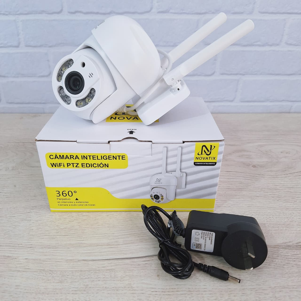 (Cámara Inteligente "Novatix" cuenta con capacidad de rotación de 360 ° para cubrir todo el entorno. Permite grabar o visualizar imágenes a todo color tanto de día como de noche. Se conecta a la red inalámbrica del hogar para monitoreo remoto. Funcionalidad PTZ: Soporta movimientos de paneo, inclinación y zoom).