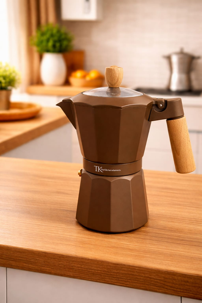 (Cafetera Italiana " The Kitchen" cuenta con una estructura de aluminio que permite distribuir el calor de manera uniforme, logrando una preparación pareja y eficiente. Su mango con acabado simil madera aporta seguridad al servir y un estilo moderno que queda perfecto en cualquier cocina. Funciona en cocina a gas, eléctrica y vitrocerámica. Capacidad: 300 CC. aprox.).