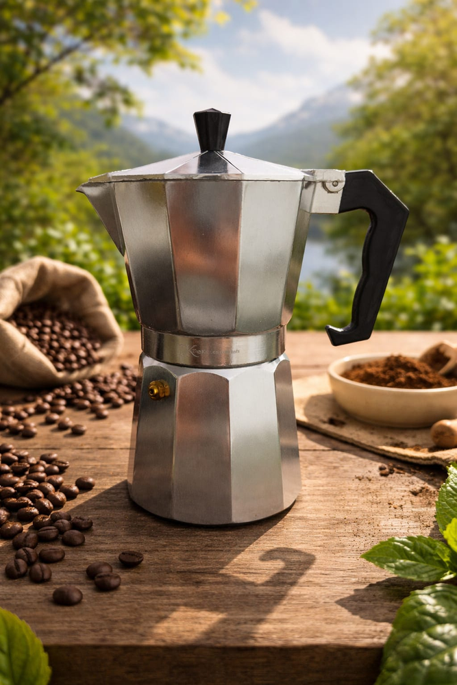 (Cafetera Italiana " The Kitchen" cuenta con una estructura de aluminio que permite distribuir el calor de manera uniforme, logrando una preparación pareja y eficiente. Funciona en cocina a gas, eléctrica y vitrocerámica).