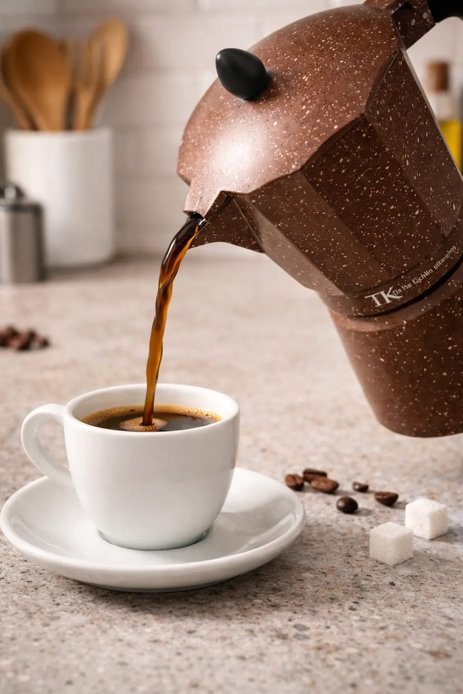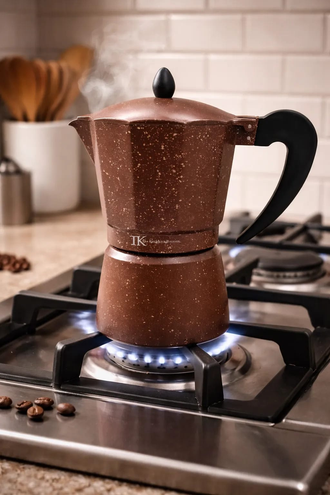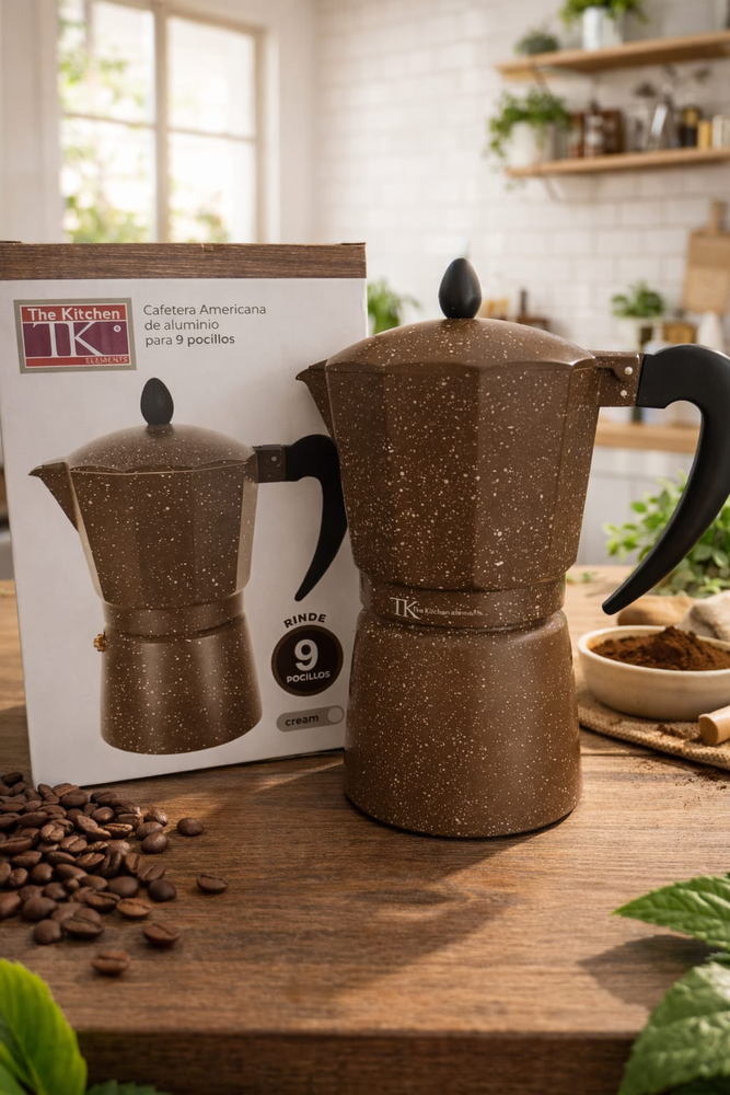 (Cafetera Italiana " The Kitchen" cuenta con una estructura de aluminio que permite distribuir el calor de manera uniforme, logrando una preparación pareja y eficiente. Funciona en cocina a gas, eléctrica y vitrocerámica).